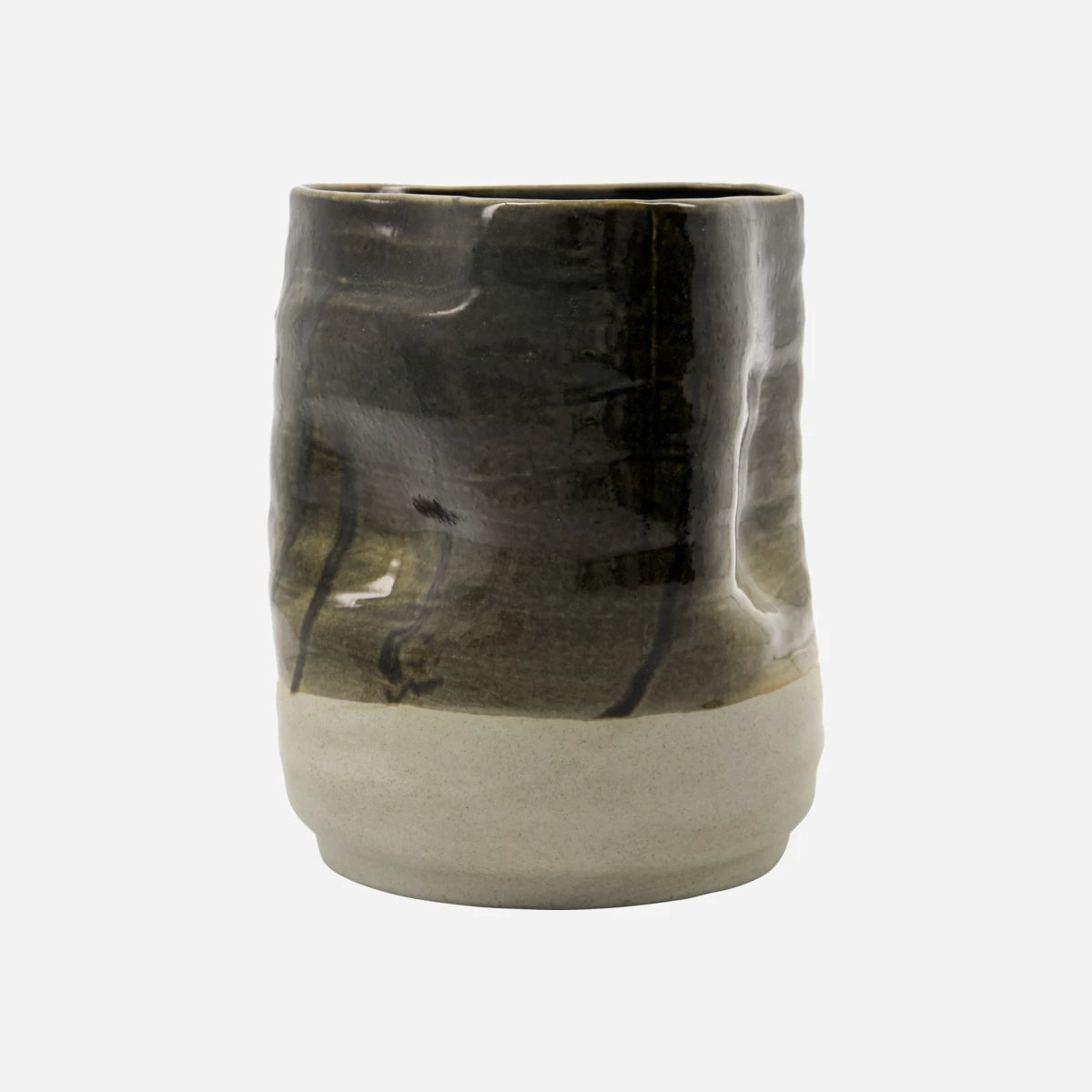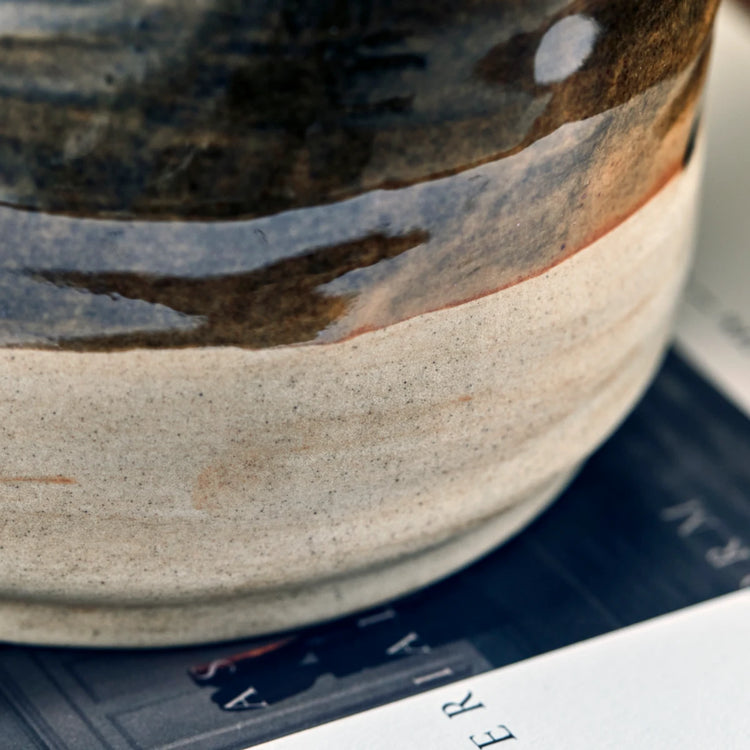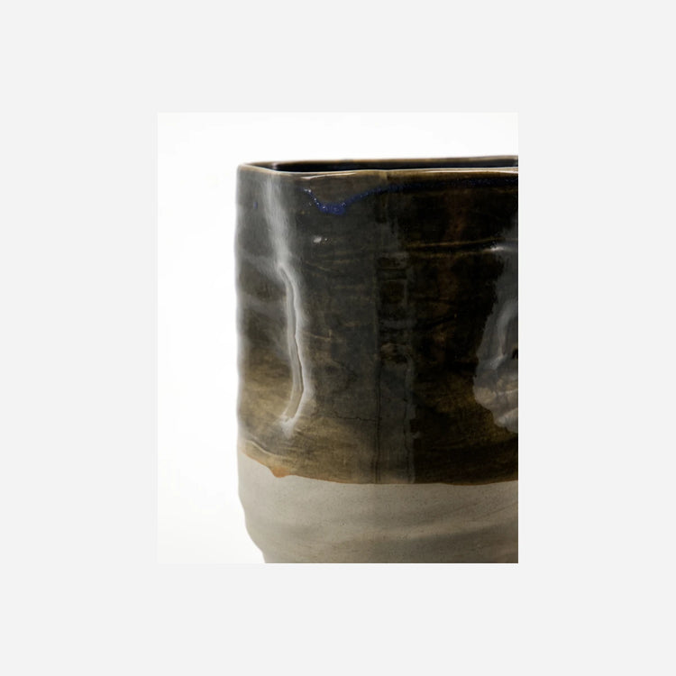 This handmade stoneware planter, finished with a reactive black glaze, adds a sophisticated touch to any space. Perfect for showcasing your favourite green plants, each piece is uniquely crafted, ensuring no two are exactly alike.- Handmade stoneware- Reactive black glaze- Unique finish varies- Ideal for green plantsEnhance your home decor with this elegant planter.