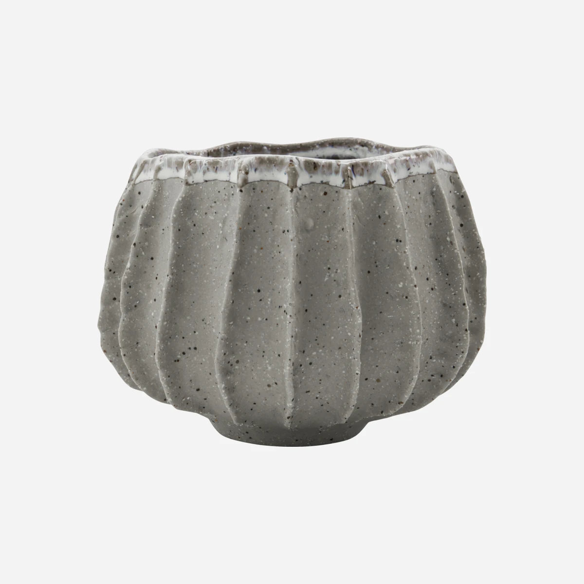 Enhance your home decor with this charming stoneware planter, perfect for adding a touch of personality to any space. Its unique fluted design and speckled beige/grey finish make it a standout piece, whether used alone or paired with a vibrant plant.- Unique fluted design- Speckled beige/grey finish- Handcrafted artistic touch- Versatile for various decor stylesAdd this distinctive planter to your collection and elevate your interior aesthetic.