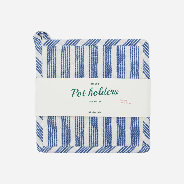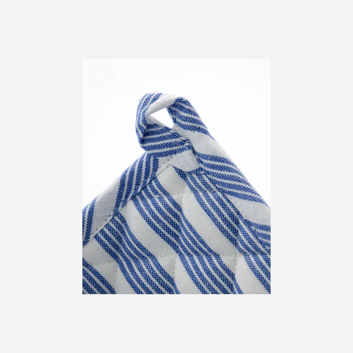 Protect your hands in style with this set of two blue and white striped pot holders. The yarn-dyed cotton and quilted design add both visual interest and reliable comfort, keeping you steady while you handle hot pans. Hang them by your cooker for instant access or let them bring a classic look to your kitchen décor. Made from 100% OEKO-TEX®-certified cotton, these pot holders blend everyday utility with timeless charm.- Set of 2 included.- 100% OEKO-TEX® cotton.- Yarn-dyed blue/white stripes.- Loop for easy hanging.Upgrade your cooking ritual - add a touch of comfort and style to your kitchen.