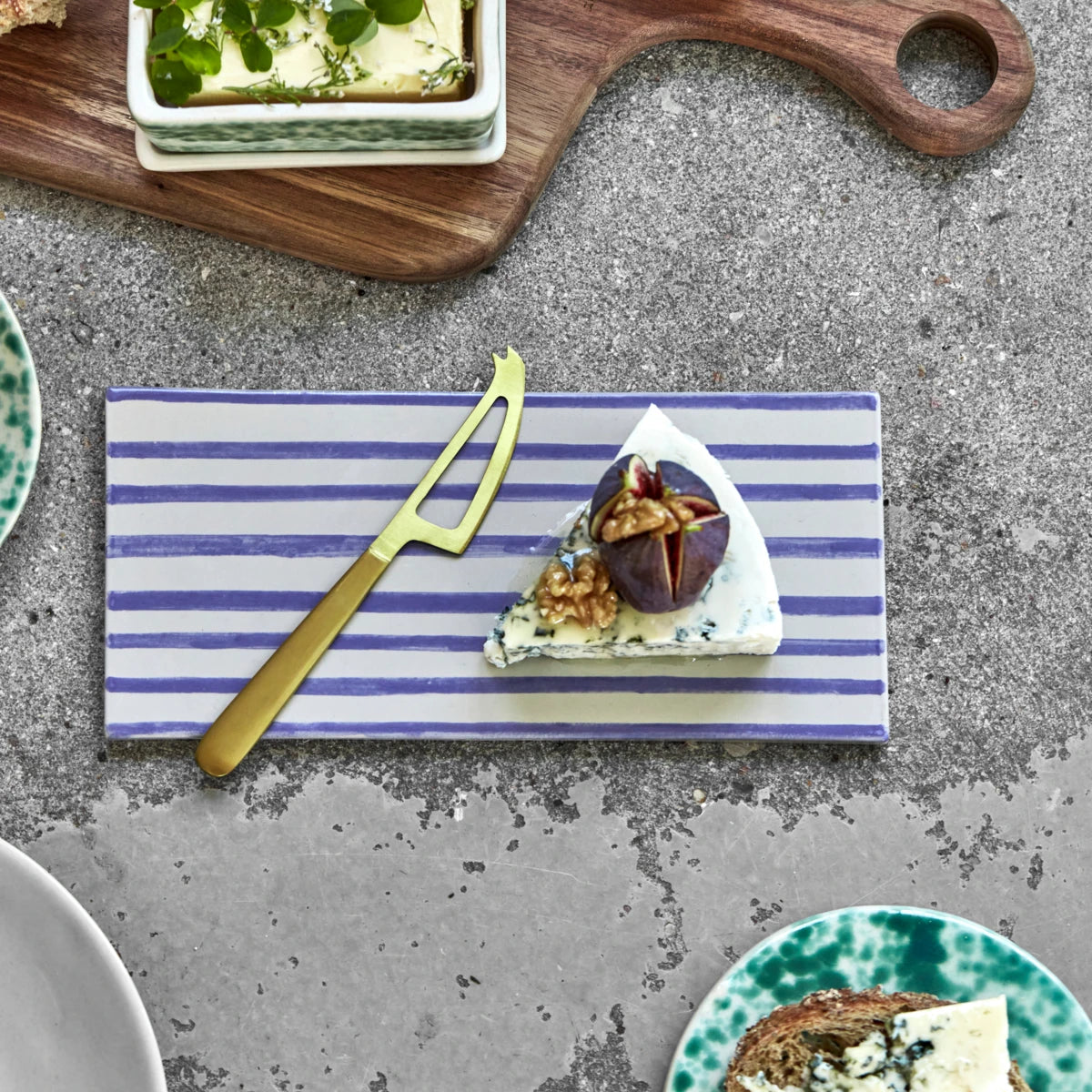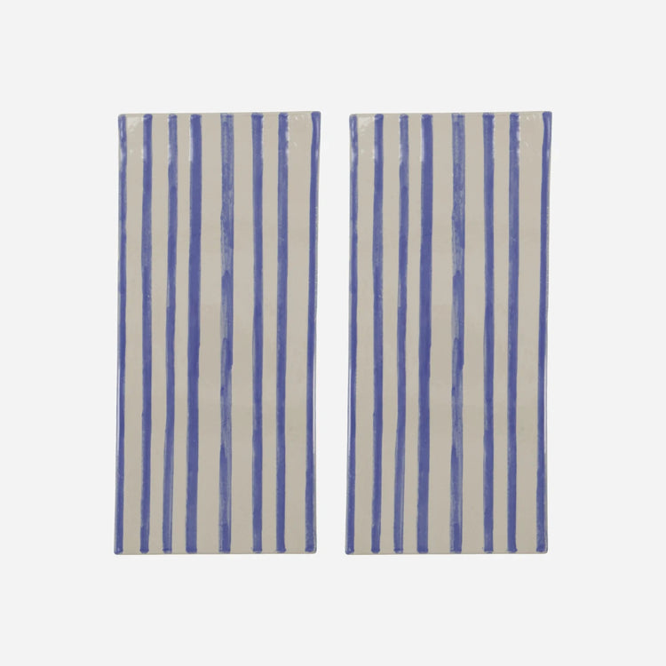 Add elegance to your dining table with this set of two ceramic serving boards. Featuring hand-painted blue stripes on durable stoneware, these boards are perfect for serving small snacks, bread, or desserts. Use them as sharing boards when entertaining guests or enjoy your morning roll with a touch of style.