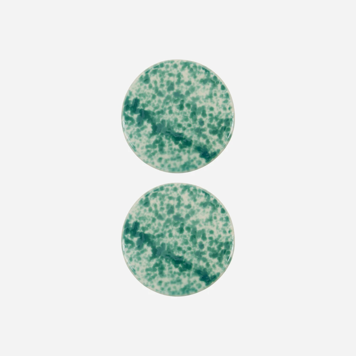 Introduce a splash of colour to your dining table with this set of two ceramic serving boards. These round stoneware pieces feature a striking hand-painted green splash pattern that adds a touch of artistry to any meal. Ideal for serving tapas, cheese, or desserts, they are perfect as a sharing board for two, pairing beautifully with tea, coffee, or a glass of wine. Their modern design and practicality make them a delightful addition to your table setting.