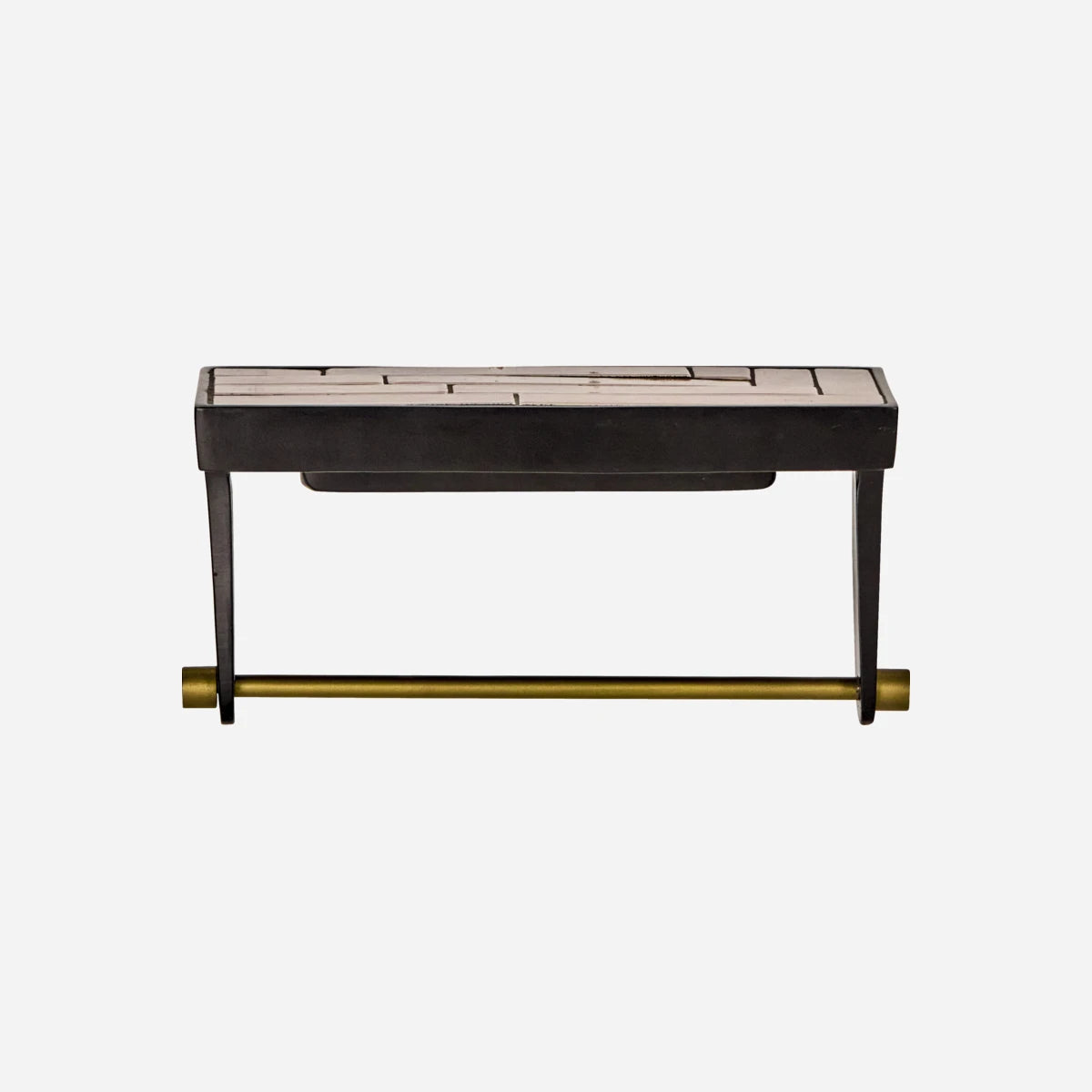 This handmade shelf combines timeless design with practical functionality, perfect for adding personality to your bathroom, kitchen, or utility room. The black aluminium frame supports a stunning surface of sand-coloured ceramic tiles, while the antique brass-finished rod underneath provides a convenient rack for towels or dishcloths. Display your favourite tealight holders or small vases on the shelf to create an inviting atmosphere with unique style.