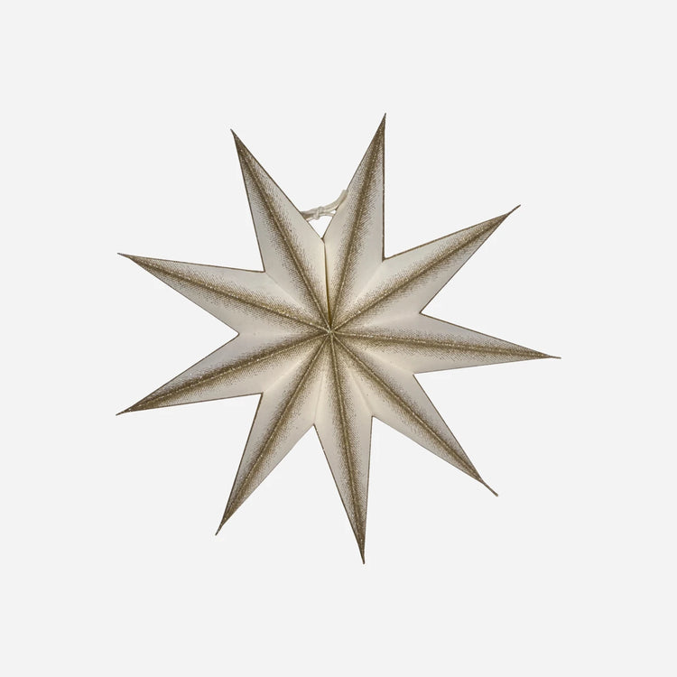 Enhance your festive decor with this exquisite handcrafted star in off-white paper, featuring a 7-point design embellished with champagne glitter. Its modern and exclusive style brings a magical touch to your Christmas setting, casting a shimmering stardust effect. Mount it with the HDBursa system for a beautifully illuminated display, creating a warm and inviting atmosphere. Hang it alone as a statement piece or cluster it with other sizes from the HD9 point series for added impact.