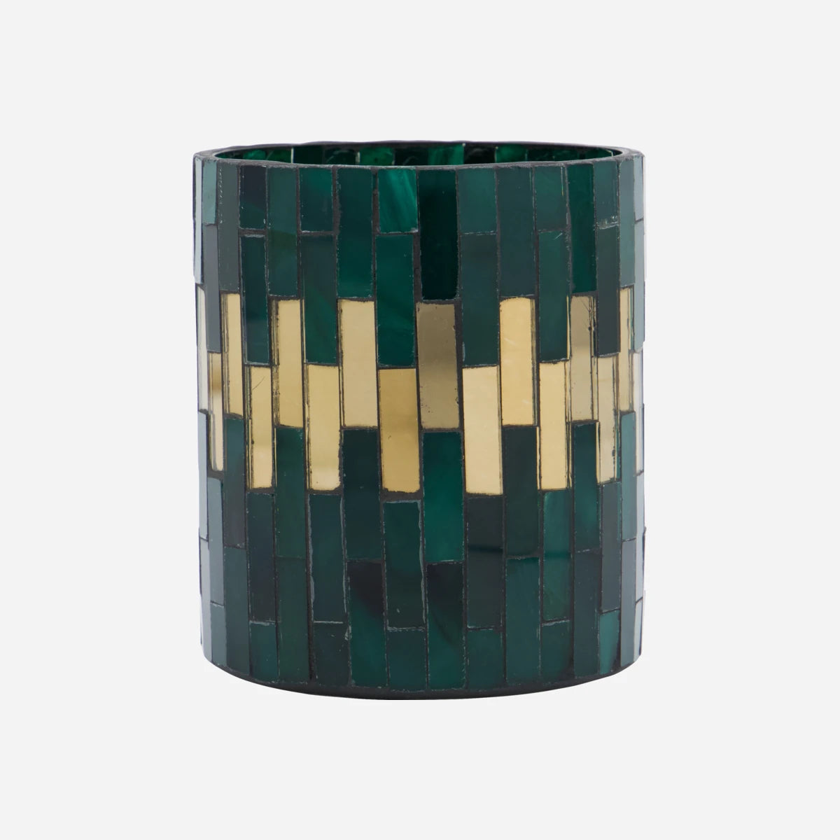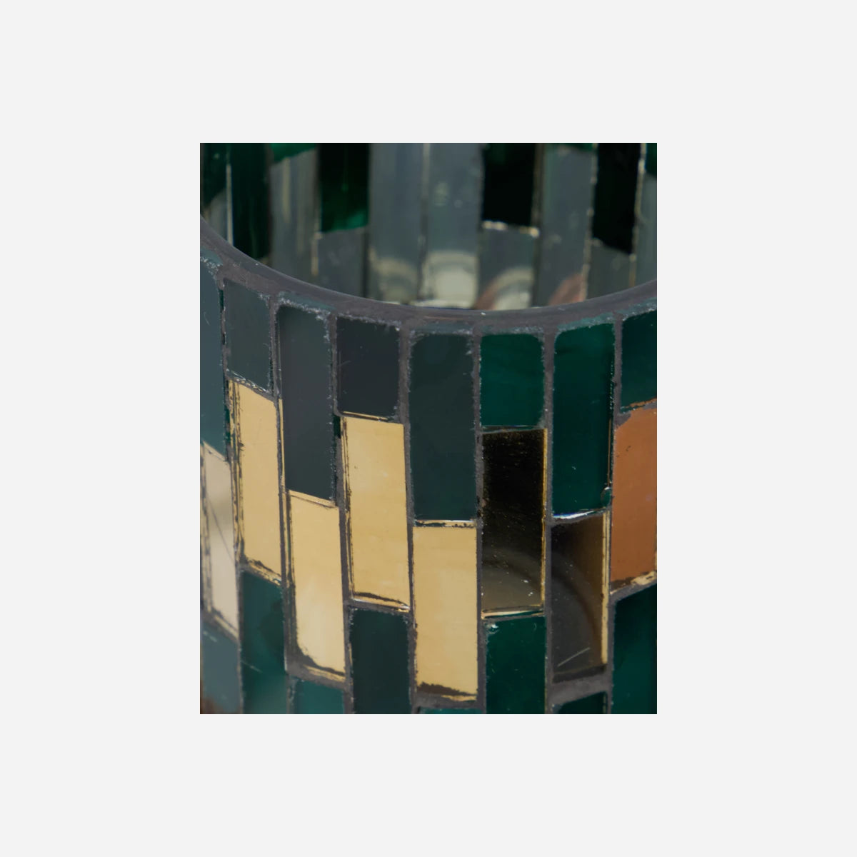 Add a touch of warmth and charm to your décor with this exquisite tealight holder. Crafted with intricate green and gold glass mosaics, this handmade piece exudes a cosy atmosphere. Its versatile design makes it perfect for your garden table, balcony, or as a decorative element on a tray.