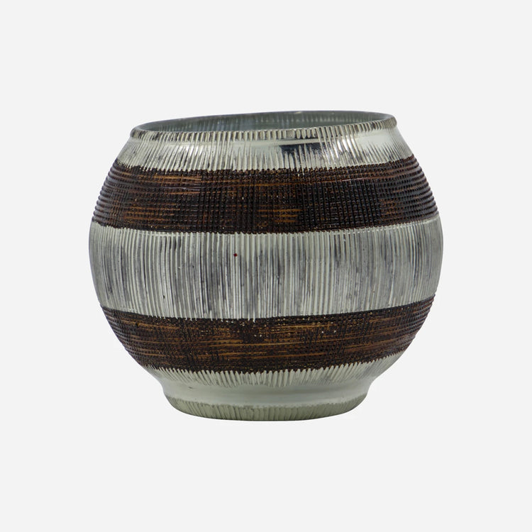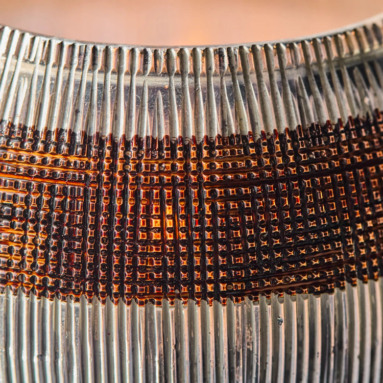 Create a warm, inviting ambiance with this set of two handmade tealight holders crafted in glass. Antique silver and brown stripes catch the light, giving a cosy, bohemian feel. The elongated, round design adds elegance to any setting - on the dining table, windowsill, or grouped with other holders for a truly personal look.