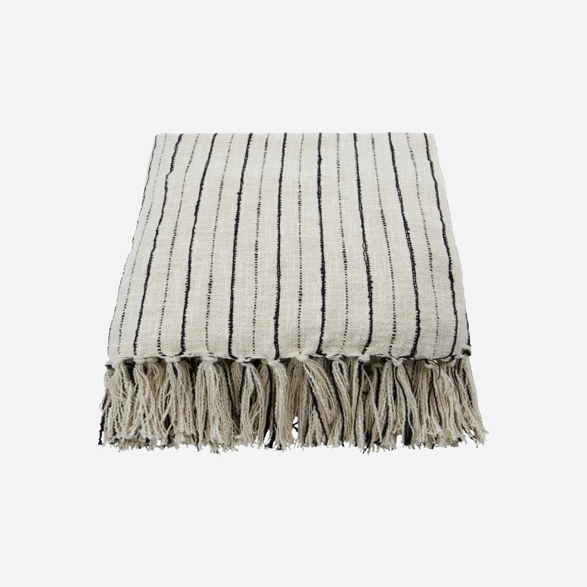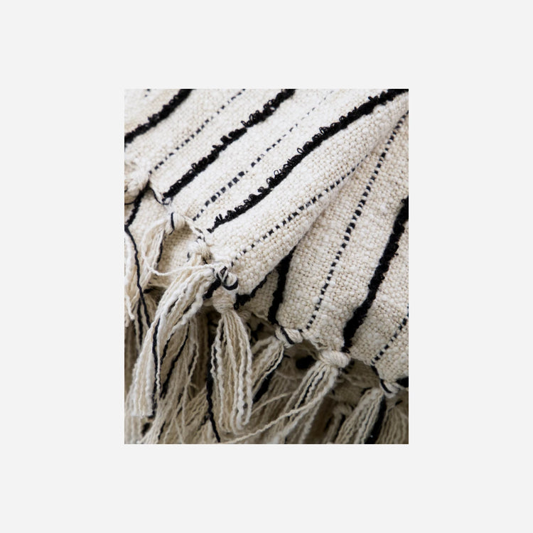 Wrap yourself in comfort and style with this handwoven throw, featuring soft cotton and subtle black stripes on an off-white base. Its timeless pattern brings relaxing warmth to your living room or bedroom. Drape it over your favourite armchair for effortless cosiness, or layer it with cushions for a welcoming sofa nook.