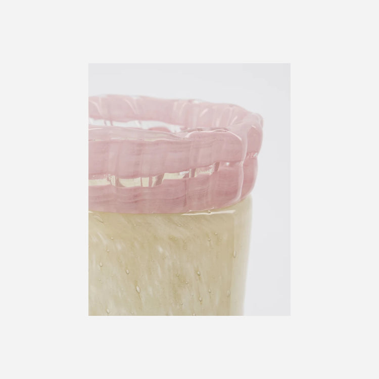 Handmade with impeccable craftsmanship, this beige glass vase infuses your home with a vibrant touch. Its unique bobble glass texture and the soft, rose-coloured curved rim create an artistic contrast that captures attention and adds charm. Use it to display flowers or as a tealight holder to cast a warm, inviting glow in your living space.