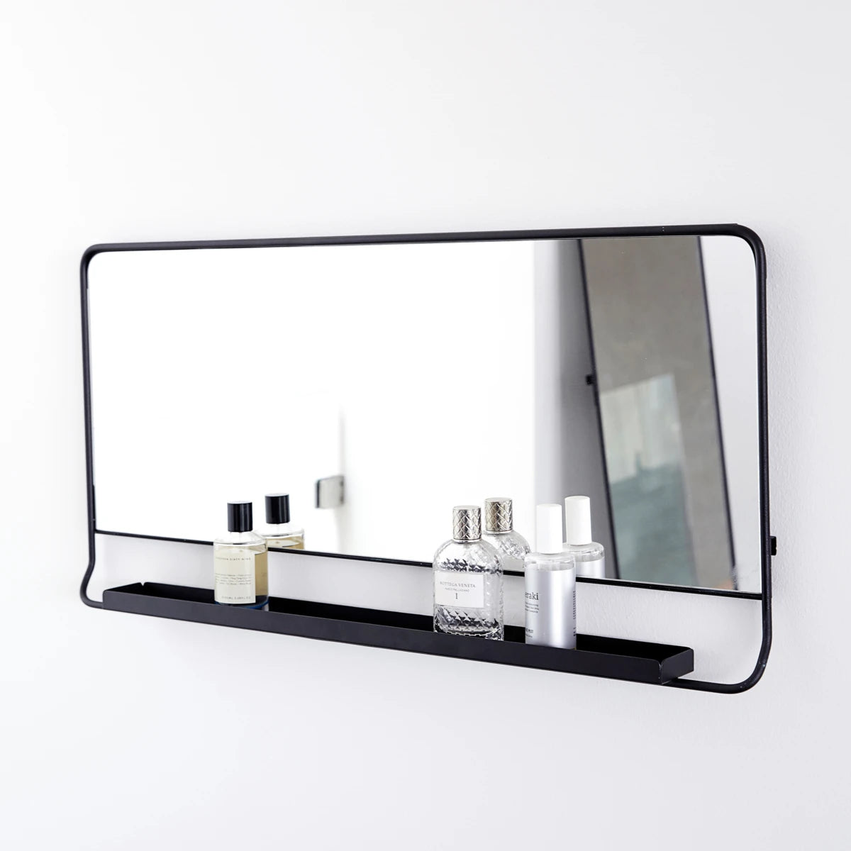 Chic is a mirror with a shelf and comes in black metal for all of your small items. The Chic mirror has a wonderful and timeless look. Use it in your hallway or bedroom. This mirror is not suitable for wet rooms.