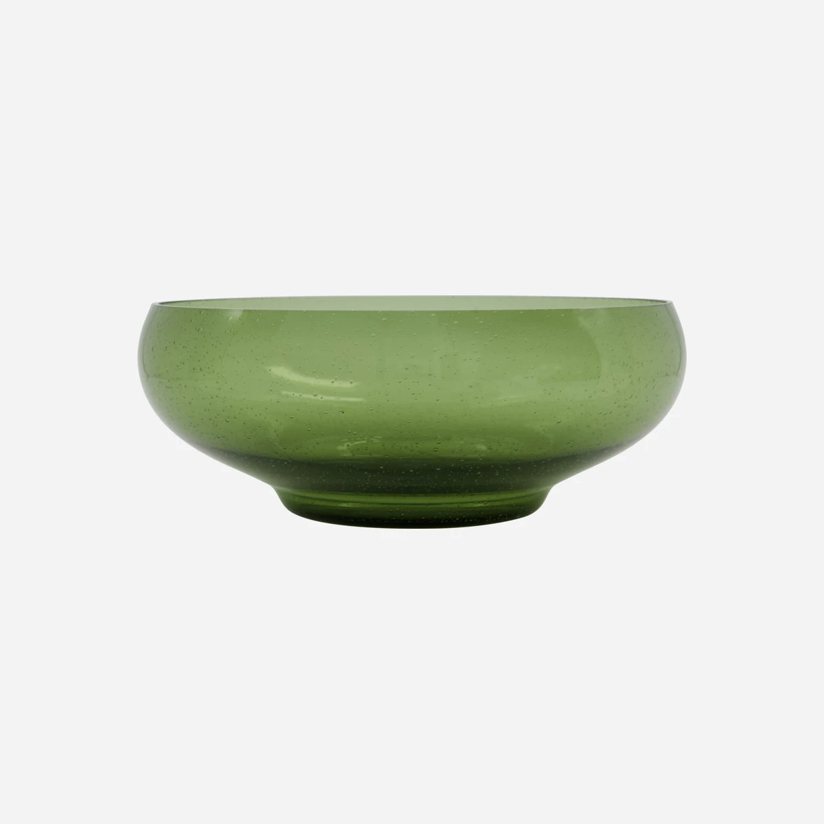 Artfully crafted in soda-lime glass, this exquisite bowl captures attention with its mesmerising green hue and subtle bubble patterns. The translucent surface creates an enchanting interplay of light, whilst its generous proportions make it perfect for both decorative displays and elegant serving.