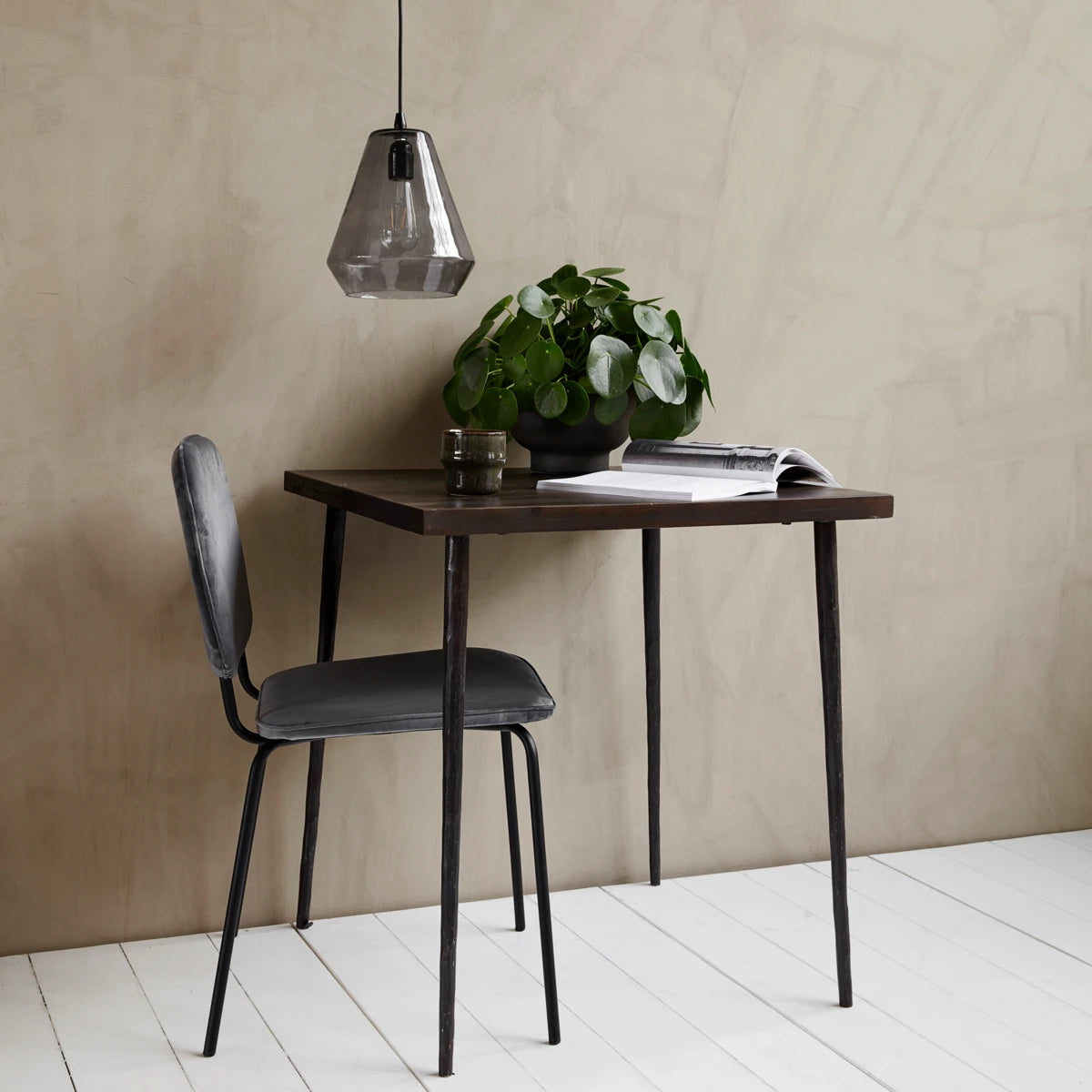 Slated is a beautiful dining table for two from House Doctor. It has a tabletop in black-stained mango wood combined with raw iron legs a design that creates a personal and warm atmosphere in the home. The raw metal legs add an industrial twist to the table. Perfect as a dining table in a smaller kitchen or as a café table. The table is also available in a lighter version that has not been stained.