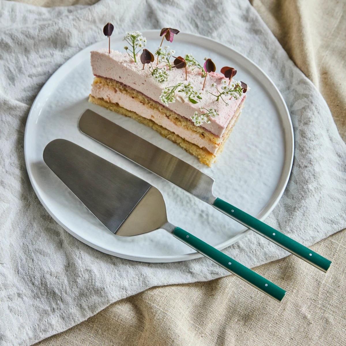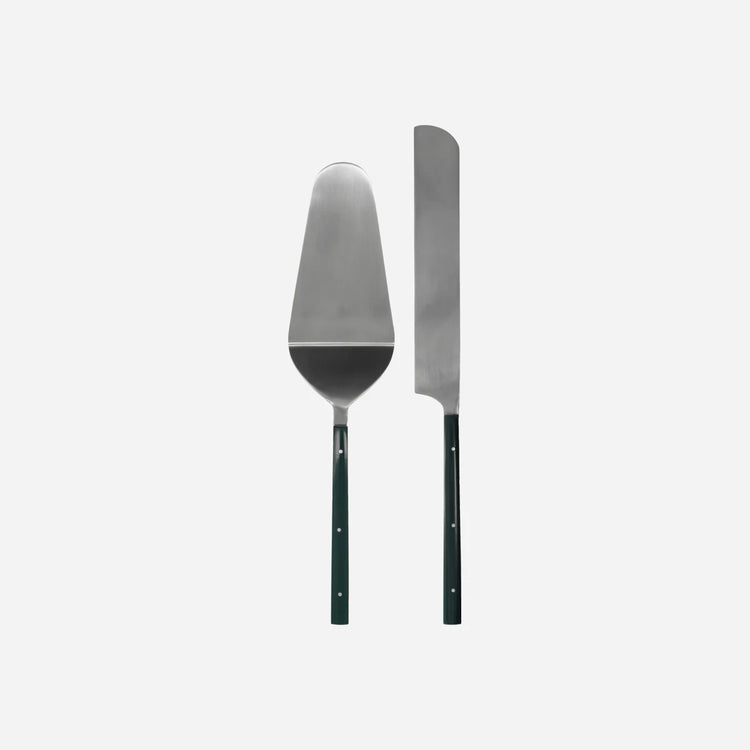 The HDLata set features two stainless steel cake servers, a spatula and a cake knife, with polished blades and green handles.