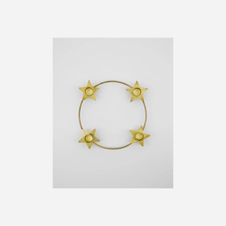 Enhance your festive decor with this candle holder in antique brass. Crafted from durable iron, its circular structure features four candle cups, each perched on a decorative five-point star. This minimalist yet stylish piece is ideal for use as an advent wreath, adding a touch of timeless elegance to your celebrations.
