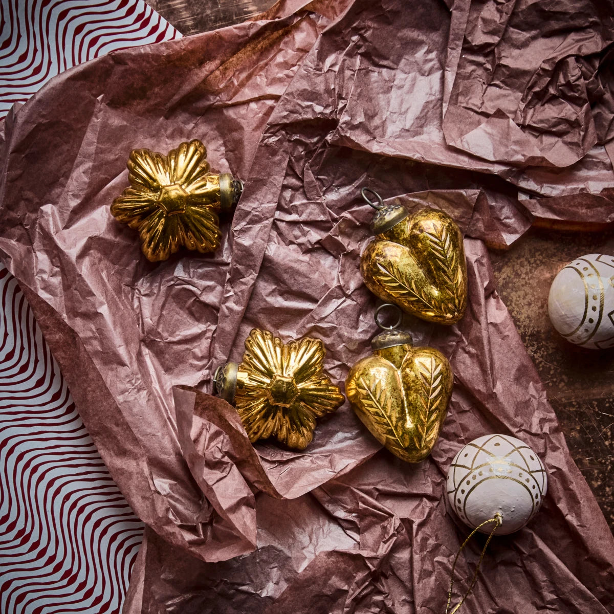 Elevate your festive decor with these exquisite golden glass ornaments, perfect for creating a nostalgic and cosy Christmas atmosphere. This set includes four handmade pieces, featuring two designs: a heart and a star. Each ornament embodies a sense of warmth and charm, effortlessly elevating your holiday decorations.