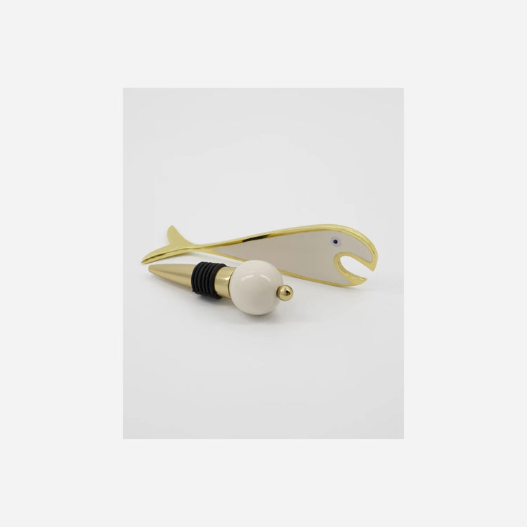 Introduce a touch of elegance and functionality to your home bar with this exquisite set of bar accessories. Featuring a fish-shaped bottle opener and a chic bottle stopper, the set combines a luxurious golden finish with subtle sand-coloured details. The clever design and high-quality materials ensure these pieces are not only practical but also visually striking. Perfect for entertaining or as a thoughtful gift, this set adds both style and joy to any gathering.