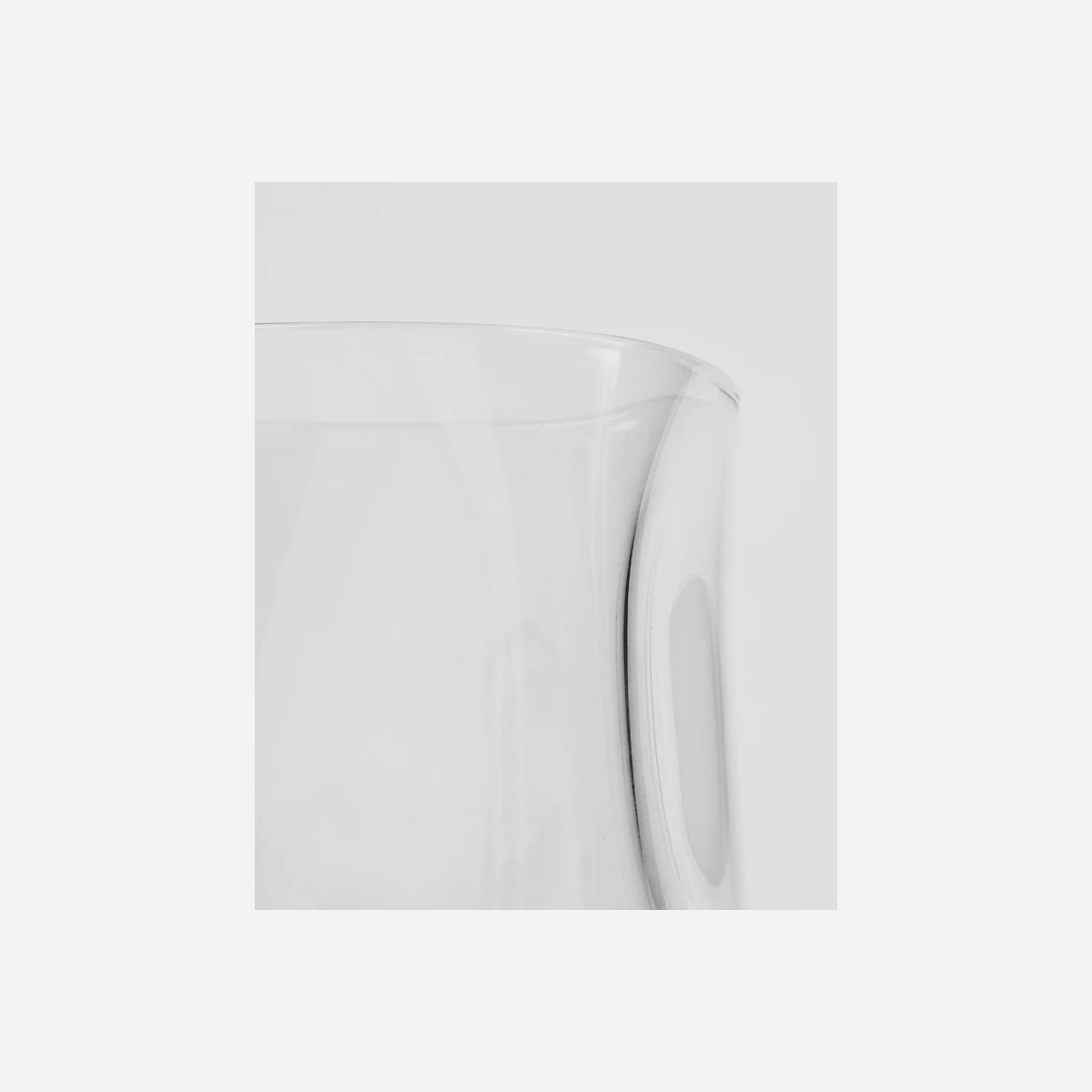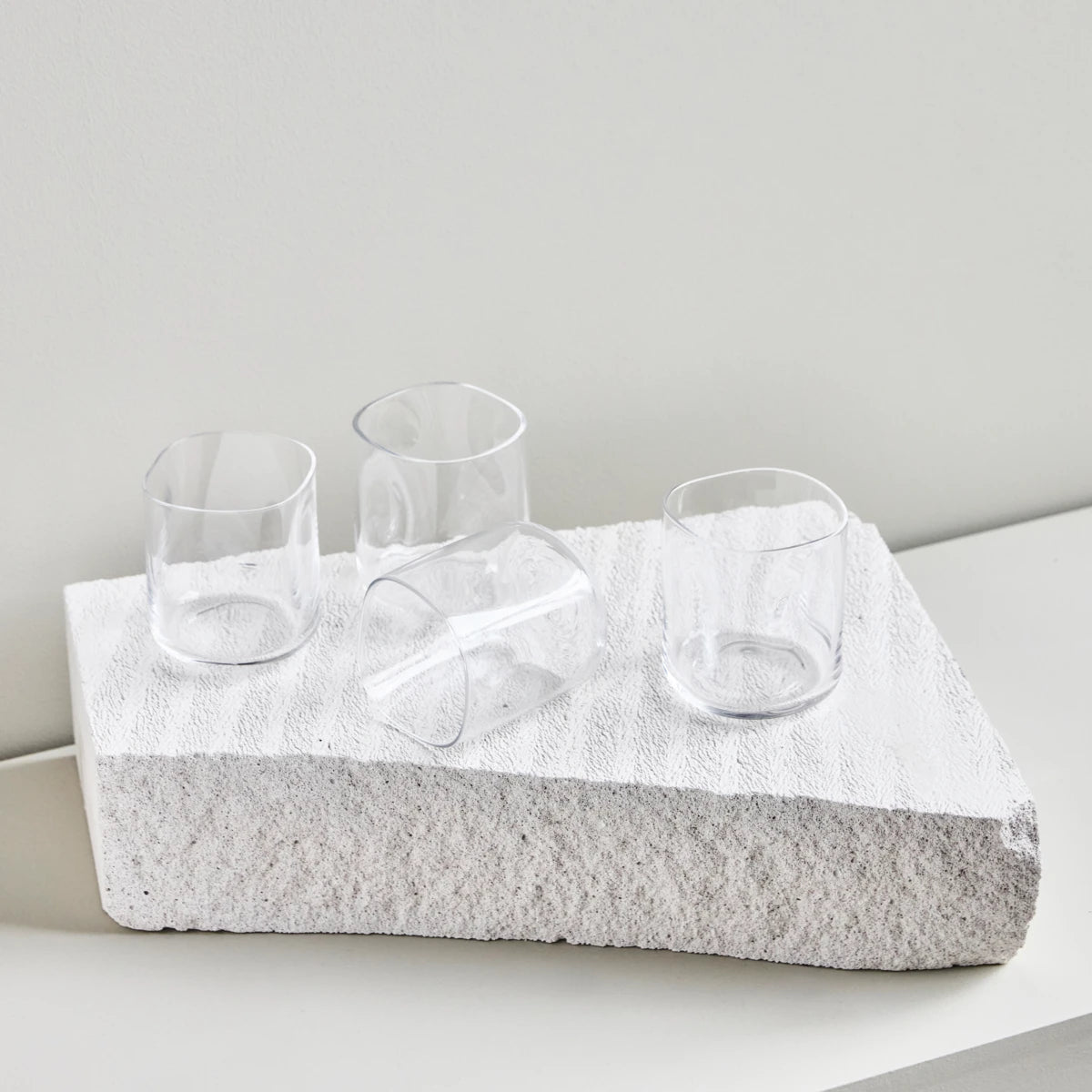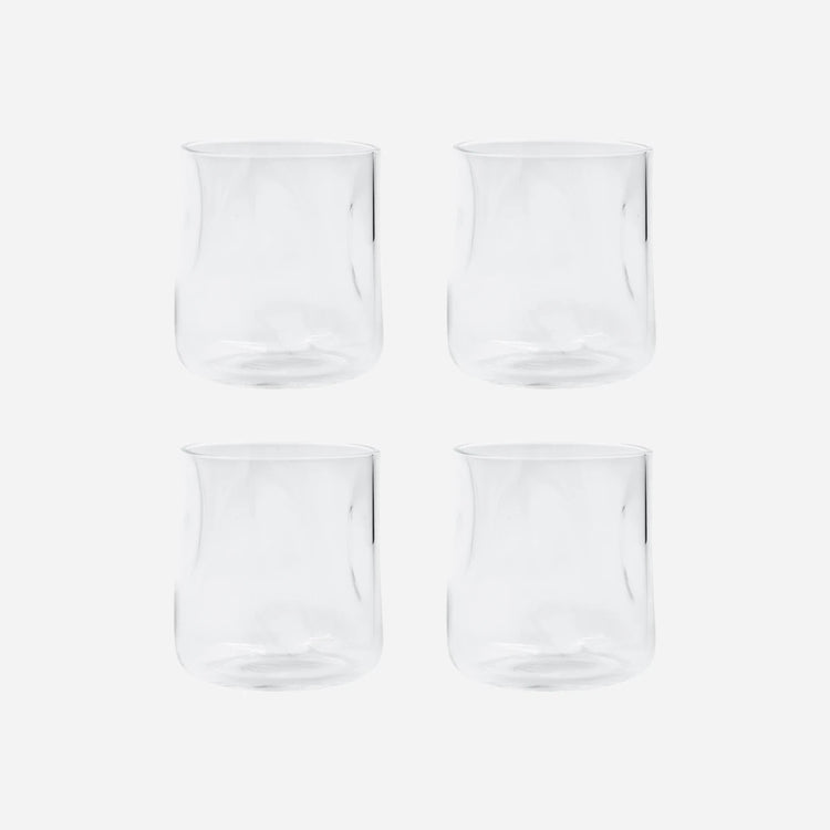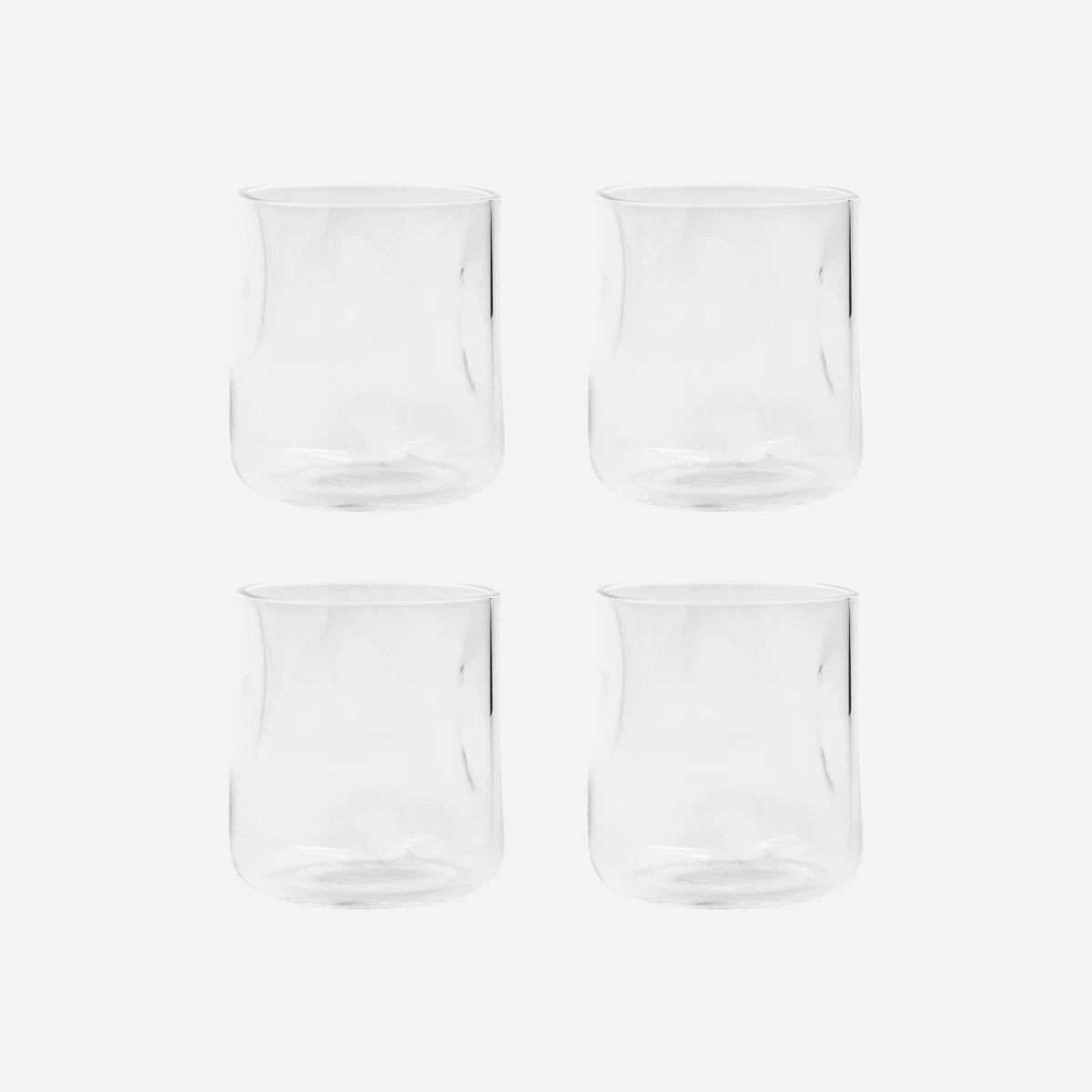 Set of four clear glasses with an organic shape that feels comfortable in-hand. Made from pressed, mouthblown glass.