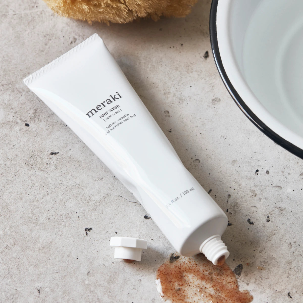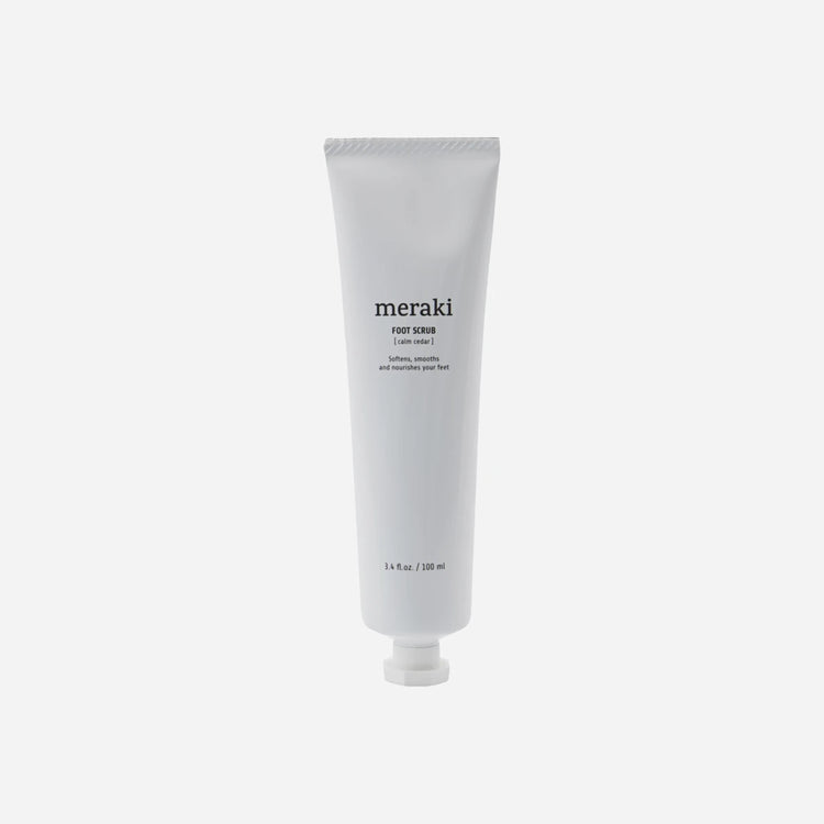 Pamper your feet with this certified organic foot scrub from Meraki. An organic apricot granulate gives your skin a gentle exfoliation while organic sunflower oil and olive oil soften it. Your feet are left smooth and well cared for, ready for increasingly warmer spring days best enjoyed in sandals. If needed, soak your feet first to loosen calluses and dab with a towel. Otherwise use the foot scrub on dry feet. Apply a suitable amount and massage your feet and shins. When you add water and rinse, the gel-like scrub turns into a milky liquid. Enjoy a well-deserved moment to yourself with this foot scrub called Calm Cedar with and revitalising scent of eucalyptus, mint and lime. Certified COSMOS organic By Ecocert