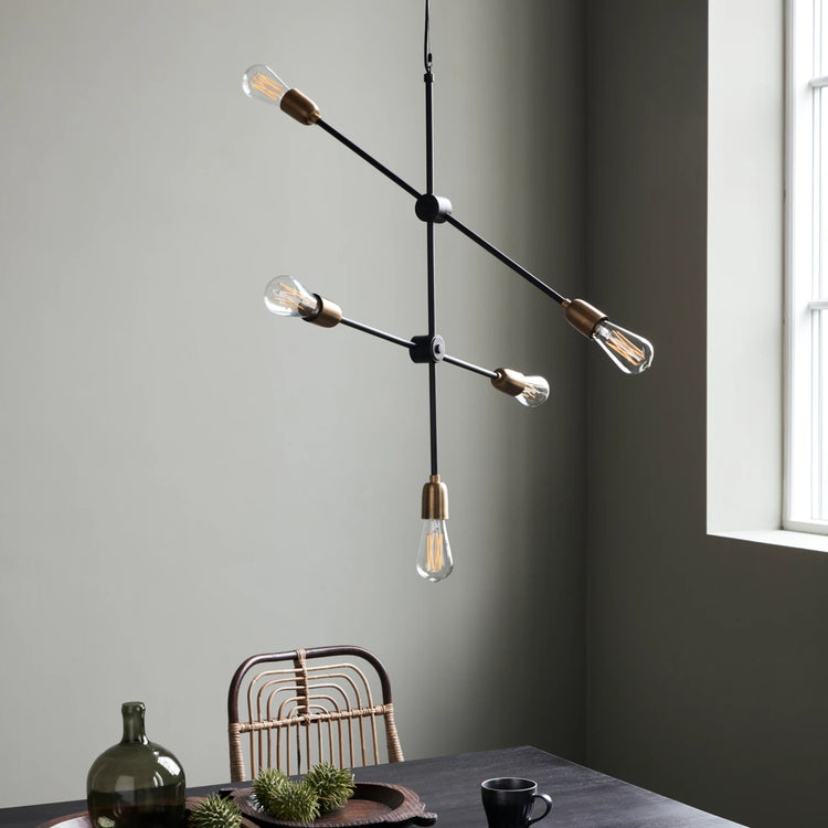 Make a bold statement with the HDMolecular pendant lamp. Its geometric shape of black iron rods and warm brass details creates a captivating play of lines and light, allowing it to hang as a true centrepiece.