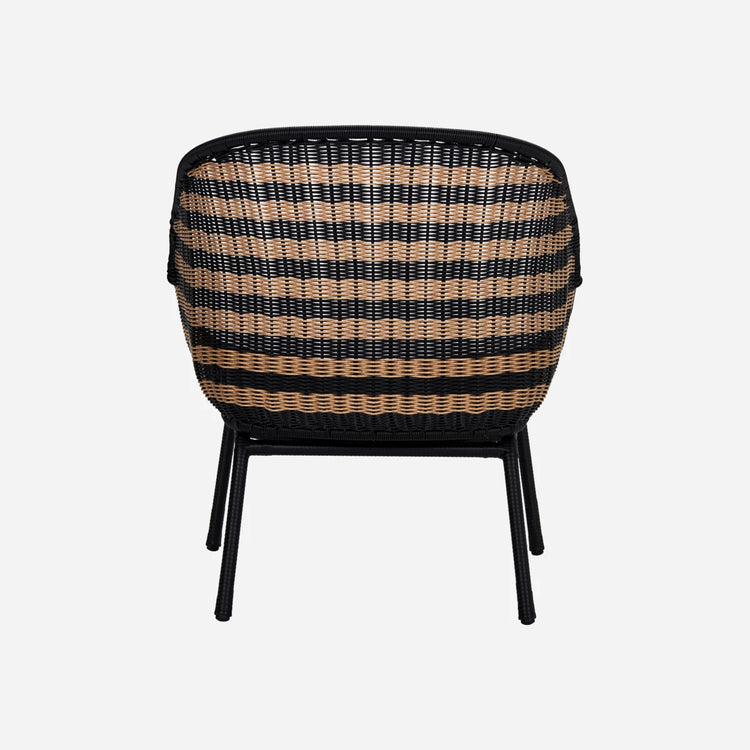This lounge chair is crafted for both indoor and outdoor relaxation, combining style and functionality. Made from durable polyethylene, its natural and black striped design adds a modern touch, while the black wrapped edge and seat create a cohesive look. The sturdy black iron legs provide a stable foundation, ensuring the chair’s longevity. Assembly is required, allowing you to personalise your space with this must-have statement piece, full of edgy charm and allure.