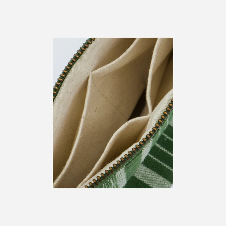 Organise your beauty essentials with style using this elegant green makeup pouch. Crafted from soft cotton and Oeko-tex certified, it combines practicality with a touch of sophistication. The natural colour palette brings a calming presence to your dressing table, making it a perfect accessory for your daily routine.