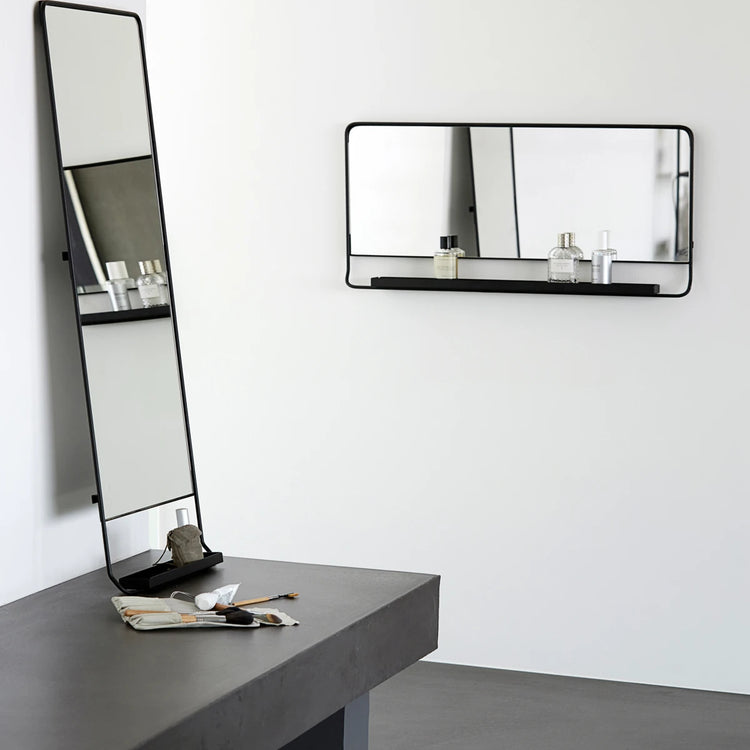 Mirror with shelf from House Doctor. The Chic mirror has an elongated design with a beautiful handy shelf, located at the bottom. The mirror has a wonderful, timeless design with rounded corners and a narrow, black metal frame. Use the mirror in your hallway or as a stunning detail in your bedroom. This mirror is not suitable for wet rooms.