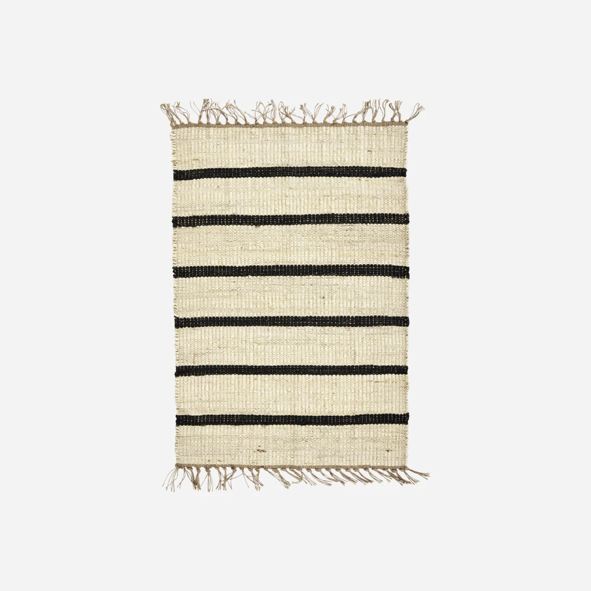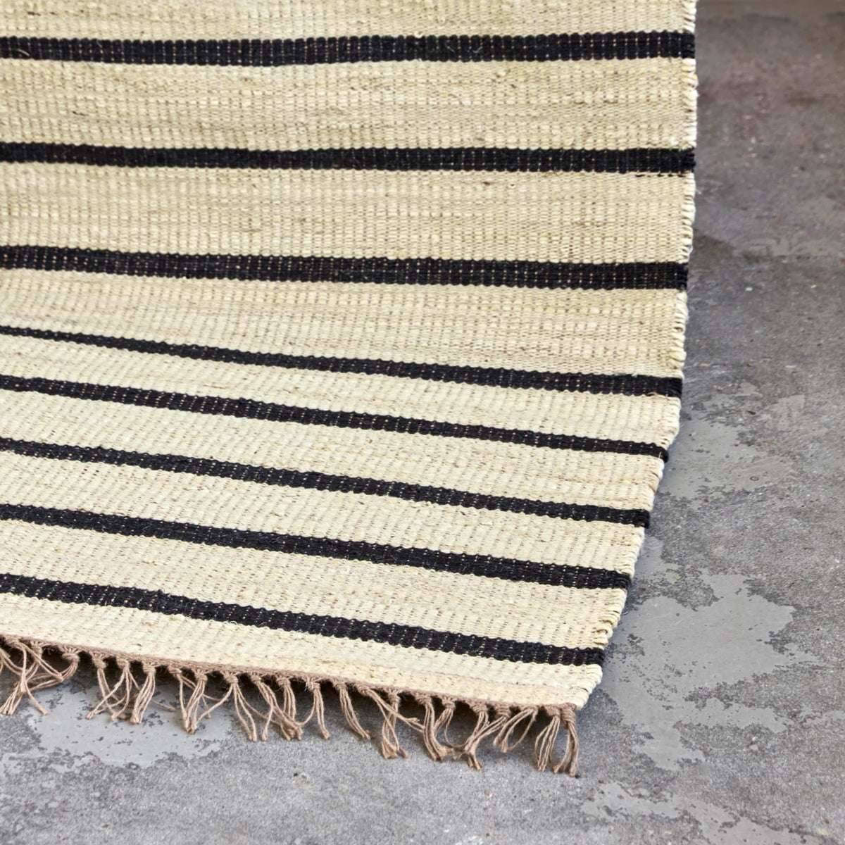 Add a touch of rustic charm to your home with this handwoven jute rug. Featuring natural tones complemented by black stripes, its simple graphic pattern fits seamlessly into your decor. Perfect for your entryway, bedroom, or kitchen, this versatile piece is designed to blend effortlessly into any space. The fringed edges provide a textured finish, adding to its artisanal appeal. Each rug is unique, with slight variations enhancing its handmade quality.