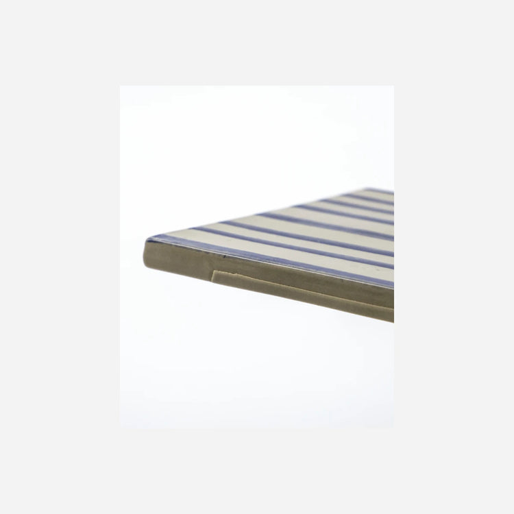 Add elegance to your dining table with this set of two ceramic serving boards. Featuring hand-painted blue stripes on durable stoneware, these boards are perfect for serving small snacks, bread, or desserts. Use them as sharing boards when entertaining guests or enjoy your morning roll with a touch of style.