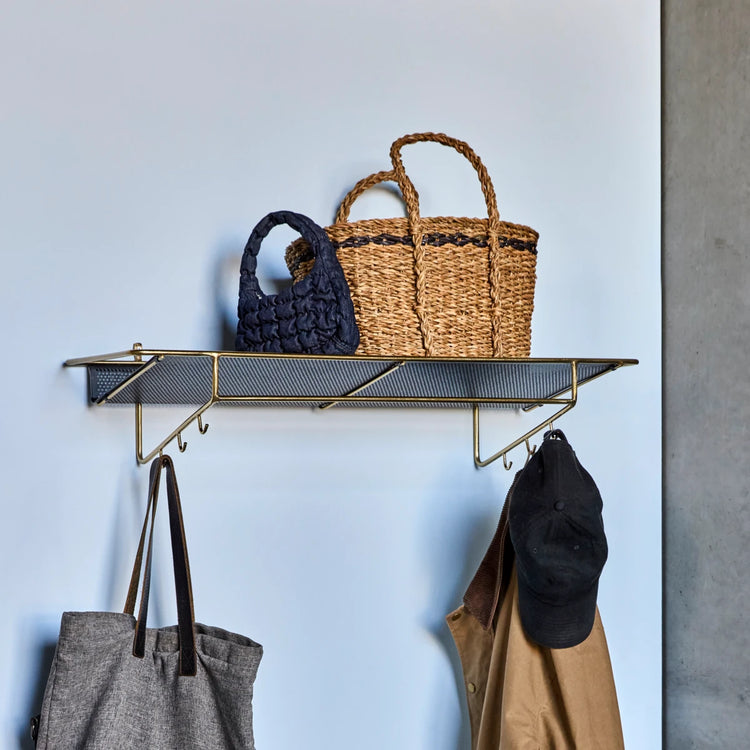 Elevate your hallway or wardrobe with a shelf that blends timeless elegance and practical storage. The handmade iron design features a black perforated shelf, antique brass frame, six hooks and a rail - ideal for coats, accessories or bags. Rounded metal tubes create striking contrast and nostalgia, while giving you space to display favourite pieces or keep everyday essentials at hand. Enjoy refined, functional style in your home or entryway.