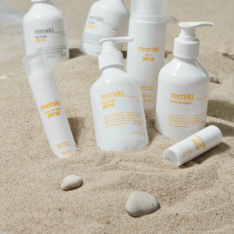 Use the SPF 50 Sun Stick from Meraki on exposed areas that need extra protection against the sun. It is non-greasy and does not leave any white residue thanks to the chemical UVA and UVB filters that also absorb harmful UV rays. Rich in beeswax, the stick is soft, easy to apply and forms a protective barrier on the surface of your skin. Both adults and children can use this perfume-free stick. Recommended by Asthma-Allergy Nordic and carries the Nordic Swan Ecolabel. Apply a protective layer to your nose, ears, lips, neck, and other areas that are particularly exposed to the sun. Repeat often.