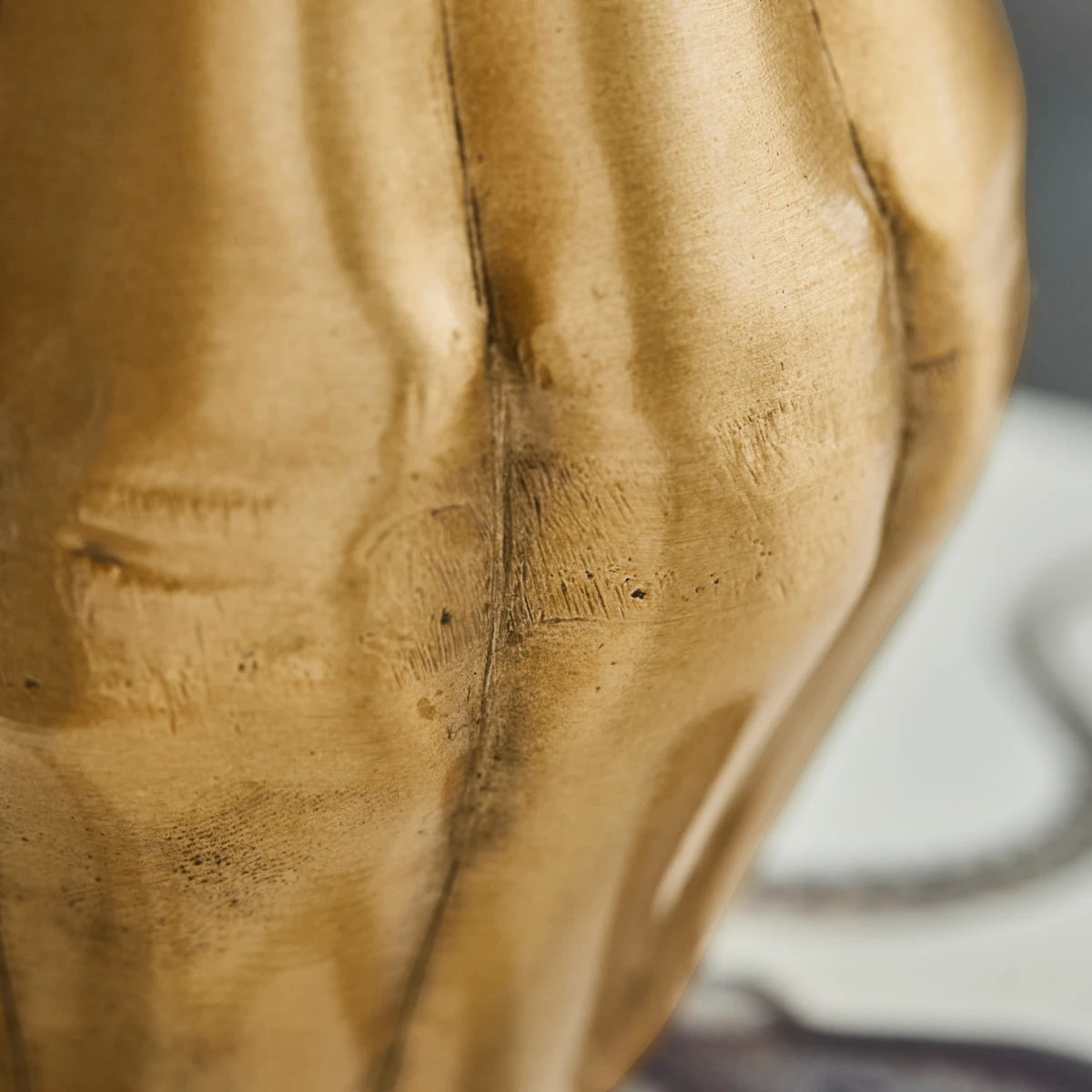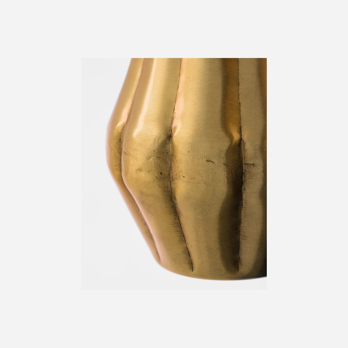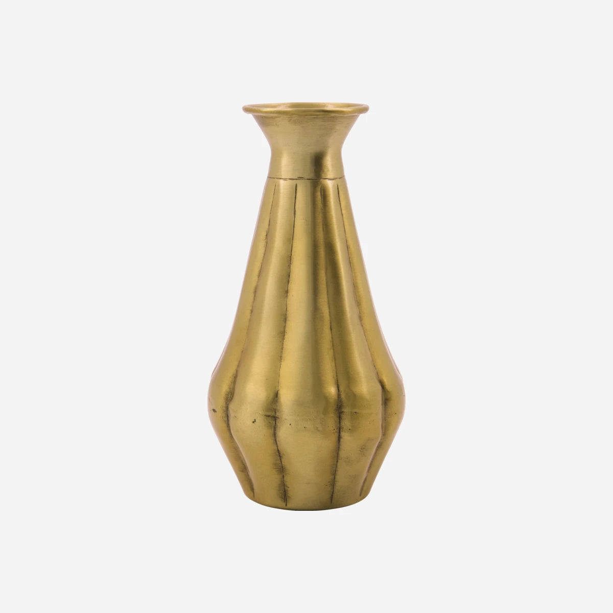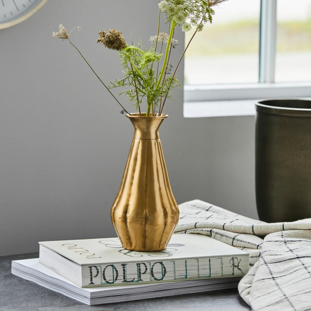 Introduce a touch of warmth and elegance to your living space with this handmade aluminium vase, featuring a striking golden finish. The vase is adorned with unique, imperfect grooves that give it an artisanal charm. Its slender form is ideal for displaying small bouquets, creating an inviting and cosy atmosphere in your home. This versatile piece is easy to style with other vases or alone, making it a perfect addition to your interior décor.