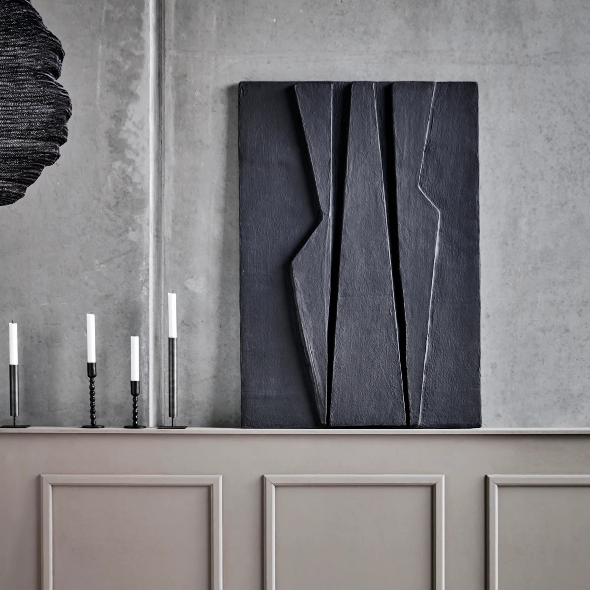 This handmade wall art in matte black adds a sophisticated and artistic touch to any room. Crafted from recycled cotton, each piece features a unique relief design with a soft, tactile appearance. Its lightweight nature makes it easy to hang, effortlessly enhancing modern and creative home environments.- Handmade, unique design- Made from recycled cotton- Matte black finish- Lightweight and easy to hangElevate your interior with this stylish and sustainable wall art.