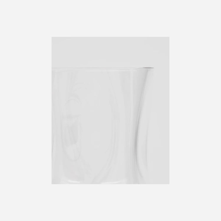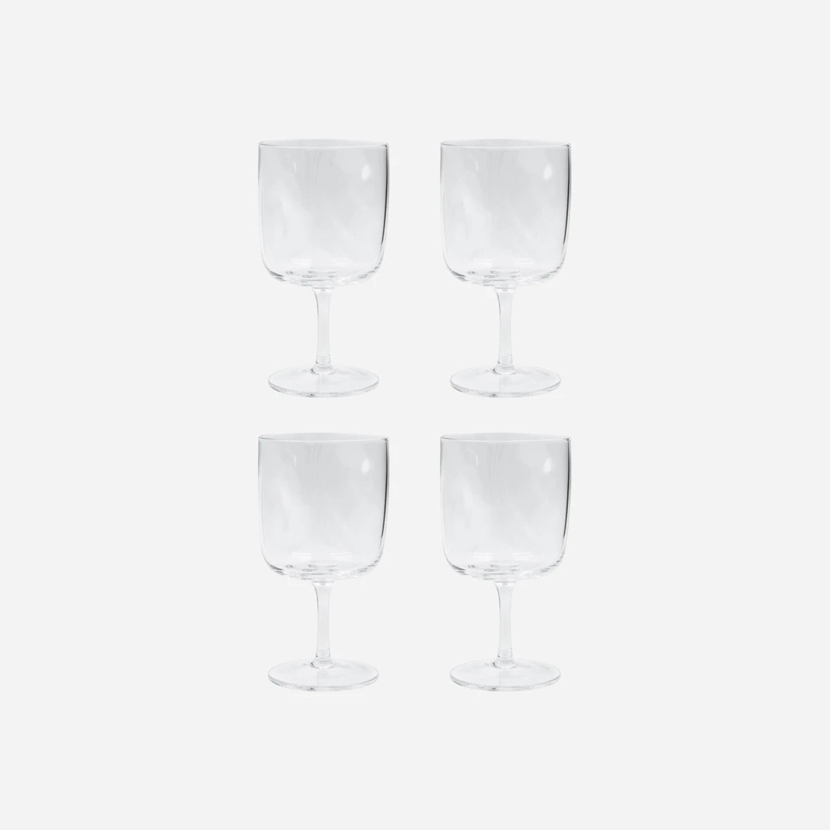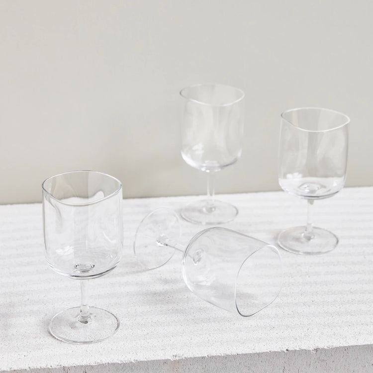 A set of four HDSand wine glasses in clear mouthblown glass. The organic silhouette and solid form give a contemporary, balanced look.