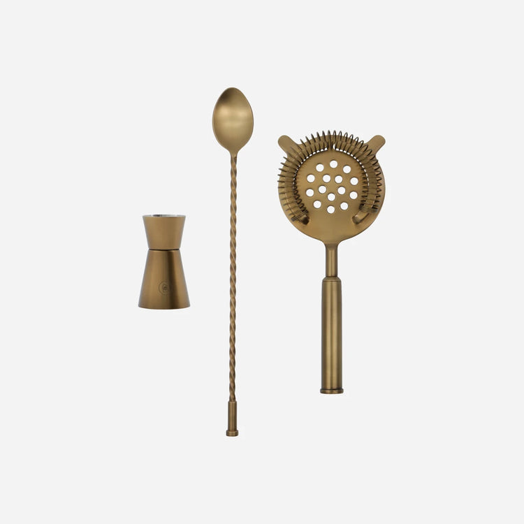Craft exquisite cocktails with this stylish stainless steel set in an antique brass finish. This set includes a measuring cup, strainer, and stirrer, combining functionality with a vintage aesthetic for a perfect addition to any bar collection.- Stainless steel construction- Antique brass finish- Includes jigger, strainer, stirrer- Finish/colour may varyElevate your bartending game with this sophisticated cocktail set.