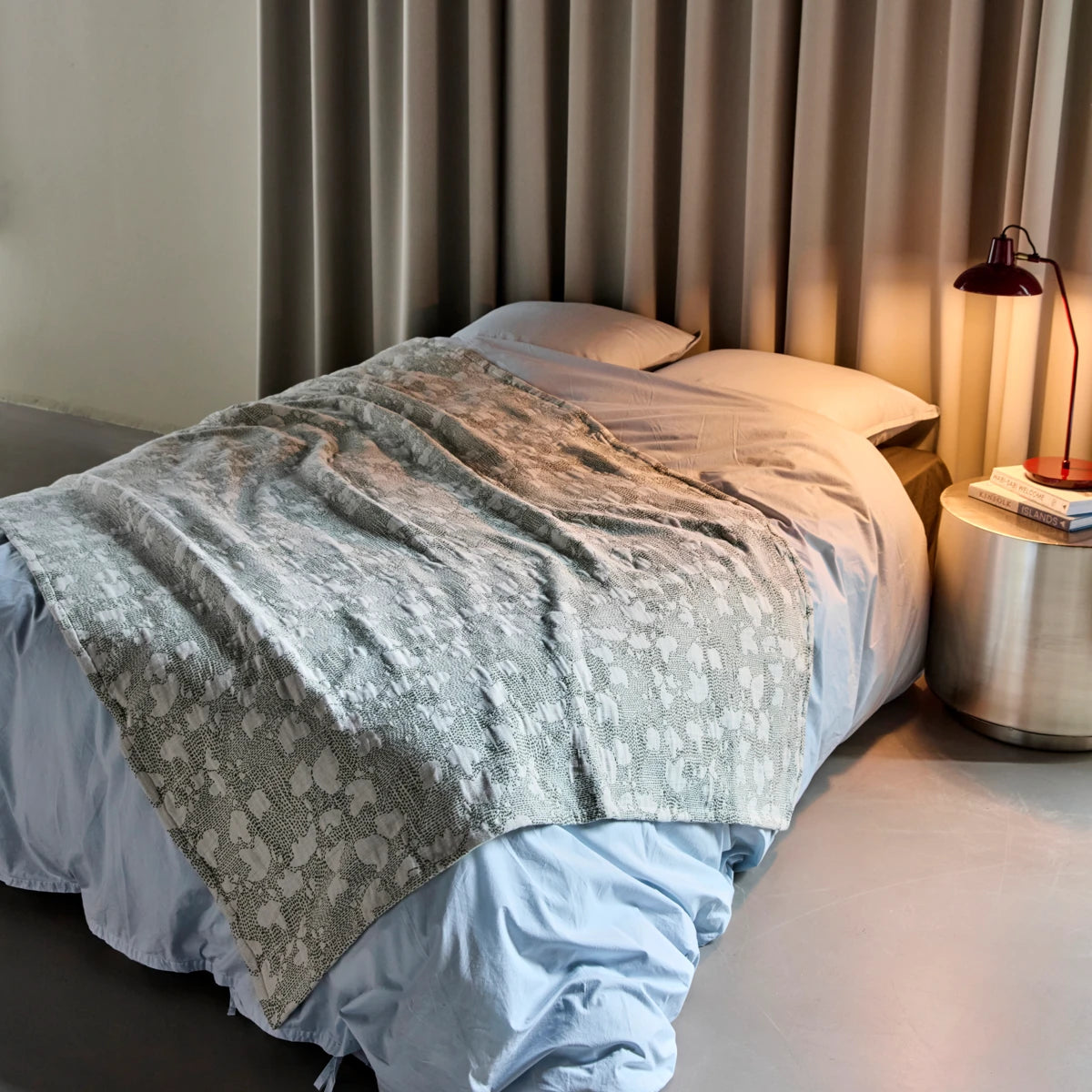 The HDMori bed throw is soft and features a handwoven jacquard pattern. Its intricate detailing and subtle green colour make a lasting impression and bring a calm atmosphere to the bedroom.