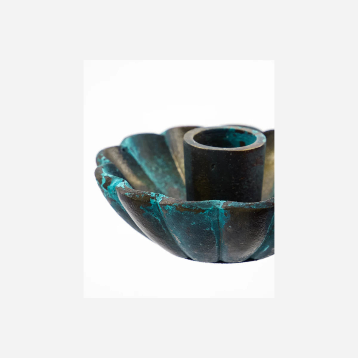 Handcrafted from aluminium with an antique green finish, this elegant candle holder adds a touch of femininity to any room. Its petite size and soft curves make it a charming addition to your decor, perfect for standard candles and illuminating spaces beautifully.- Handmade, unique finish- Antique green aluminium- Fits standard candles- Petite and charmingAdd a touch of elegance to your home with this exquisite candle holder.