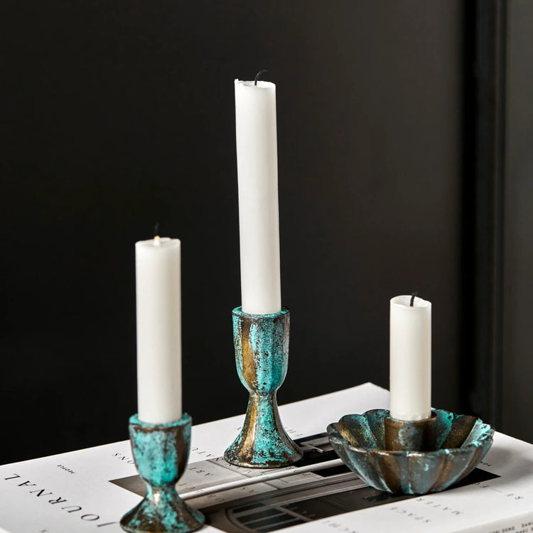 Crafted from cast aluminium, this elegant candle holder offers a vintage charm with its antique green finish. Perfect for taper candles, it enhances any informal table setting or interior décor, adding a touch of sophistication reminiscent of aged copper.- Antique green aluminium finish- Suitable for taper candles- Handmade, unique variations- Perfect for informal settingsAdd a touch of vintage charm to your home with this exquisite candle holder.