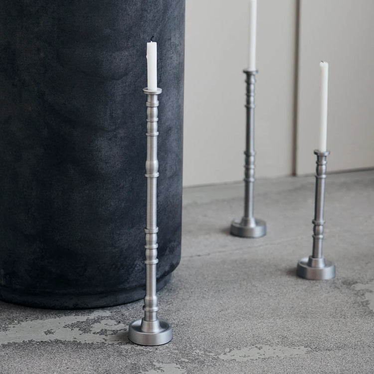 Tall candlestick from House Doctor in an elegant and minimalist design. The details and colour give off a certain classic vibe while the aluminium material makes it contemporary. Jersey, as the candlestick is called, comes in 3 sizes and this is the tallest version. Combine all heights to create a cosy and impressive display on the dining table. Adding candles will only make more of an impact. Your furniture stays protected as Jersey comes with a felt pad at the bottom. For candles with a diameter of 1.2 cm (201210002).