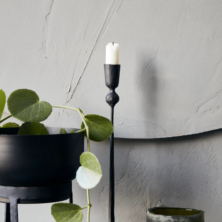 Inject some industrial and understated style into your home décor with the black candle stand called Trivo. The handmade quality shines through in the surface that shows how the candle stand was formed. The heavy iron and the slim, elongated shape will only become more striking when you add a candle. This is the medium sized version of the Trivo candle stands that come in 3 sizes. Mix the heights to create a stunning display that takes the focus in your windowsill or as a centrepiece on your dining table.
