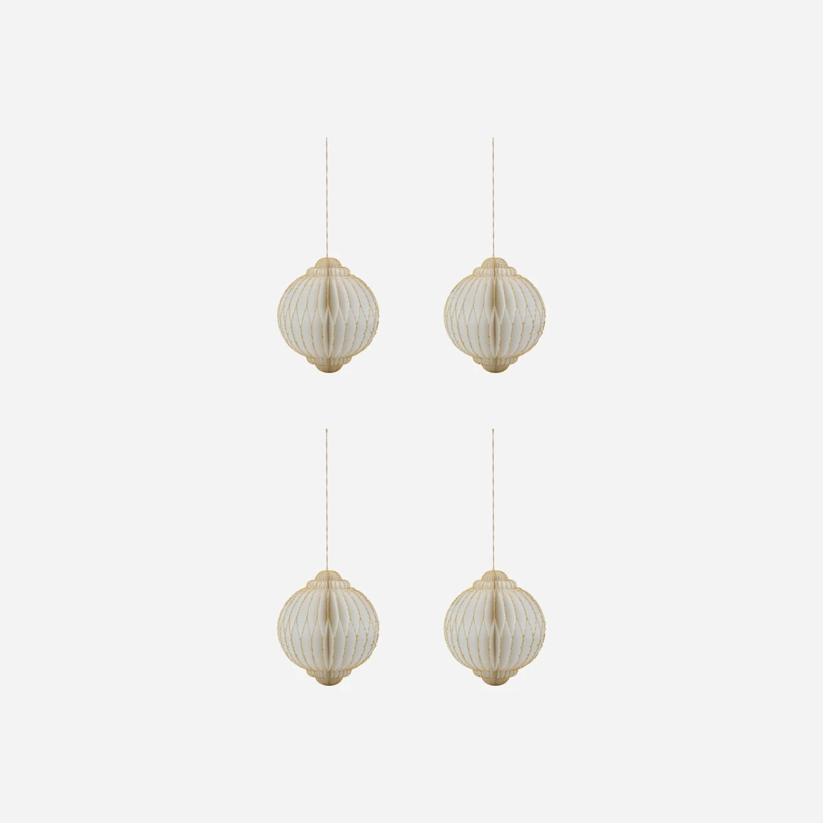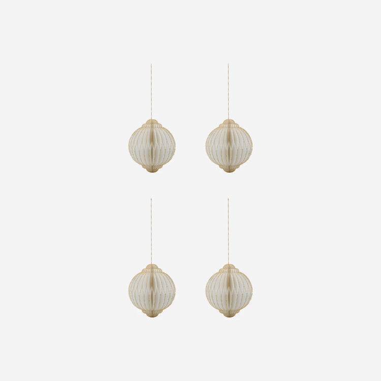 Create a magical festive atmosphere with this set of four exquisite ornaments. Crafted from paper, each ornament features a unique off-white hue with elegantly deckled edges. The hand-painted gold glitter detailing adds a touch of luxury and sparkle, making them perfect for the holiday season. Hang them together for a cohesive look or mix with other decorations for a personalised touch.