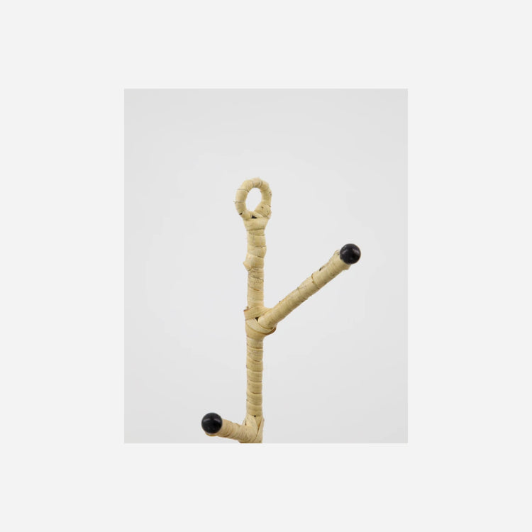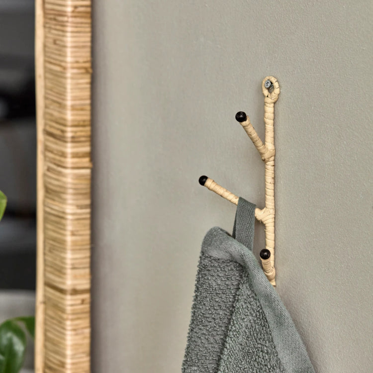 Add warmth and charm to your hallway or wardrobe with this handcrafted hook rack. Made from durable iron wrapped in natural cane, it perfectly balances utility and style. The three black-tipped hooks are ideal for hanging bags, scarves, or towels, adding both function and a welcoming touch to your home decor. Its natural tone seamlessly integrates with any interior, bringing a cosy atmosphere to your space.