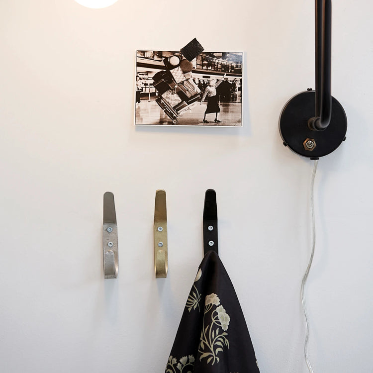 Forged from House Doctor is a rustic coat hook with a simple look. It is made of iron and covered with a golden finish. Put 2-3 hooks together in the hallway to store your familys outerwear and bags. You can also use the hooks for towels or jewellery in the bathroom. The golden design will undoubtedly bring warmth and elegance to any room. Please note that the material is susceptible to rust if it comes into direct contact with water.