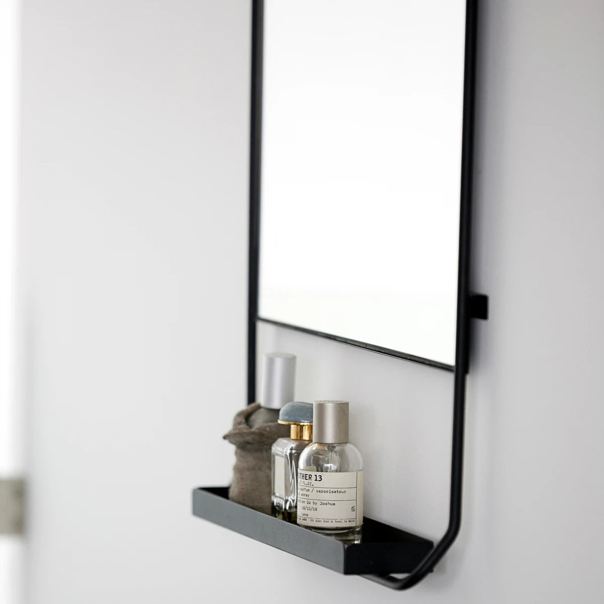 Mirror with shelf from House Doctor. The Chic mirror has an elongated design with a beautiful handy shelf, located at the bottom. The mirror has a wonderful, timeless design with rounded corners and a narrow, black metal frame. Use the mirror in your hallway or as a stunning detail in your bedroom. This mirror is not suitable for wet rooms.