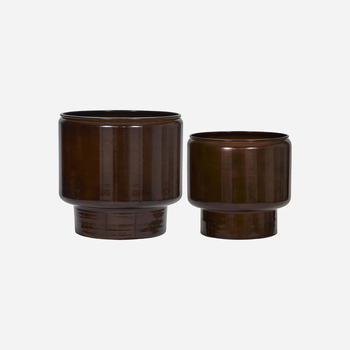 Create a relaxing outdoor space with this set of 2 iron planters from House Doctor. Their dark brown glaze draws attention to your plants with its glossy finish and enhances the overall look and feel of your garden or balcony. Place the planters by your front door, on your patio or gather a selection of planters by your outdoor furniture to create a calming oasis. A place to relax for hours on end. The planters may vary in finish and colour as they are made of recycled steel from cars which are cut up and turned into these unique designs. Please note that the planters come with drainage holes and plugs for both indoor and outdoor use. As the planters are not 100% waterproof, we recommend using an insert or placing a protective pad underneath.