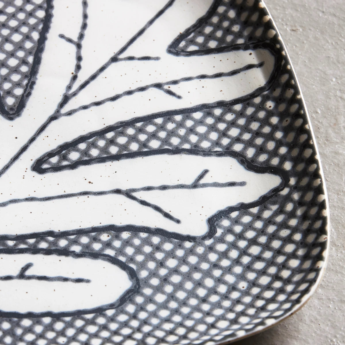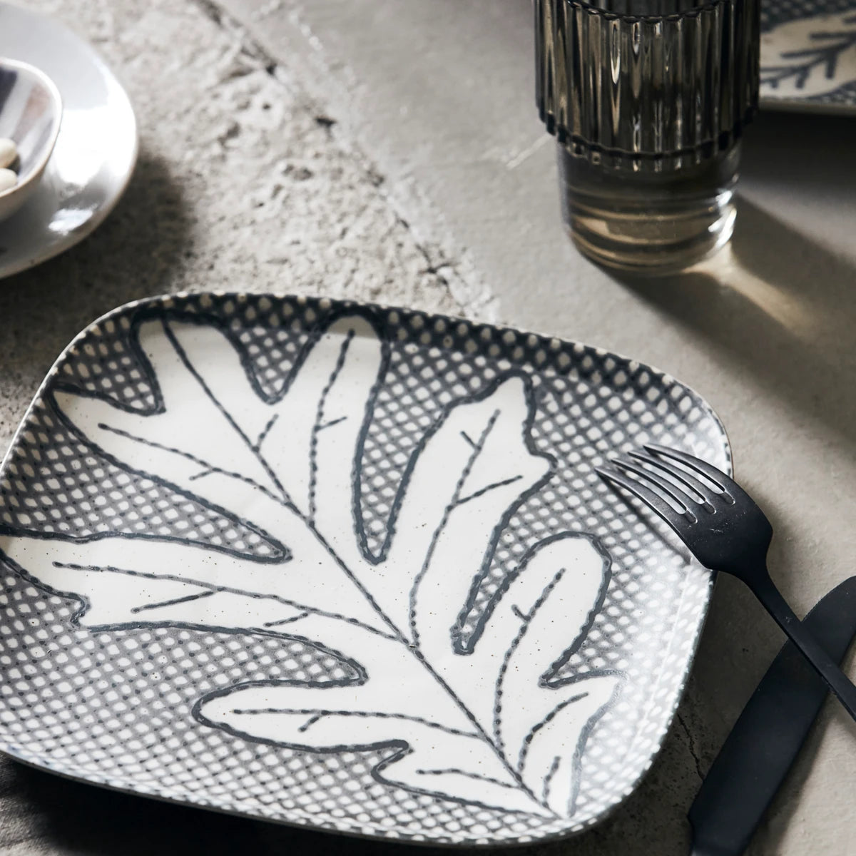 Ceramic plate called Oak from House Doctor in matte colours. The rounded corners soften the square shape on this plate with a leaf motif. At first glance, the design might give off some retro vibes, but it all depends on how you use the plate and which items you choose to mix it with. Invite nature onto your table and combine with our other leaf motif plates or mix with plates and bowls in a wide range of materials and patterns for a truly personal table arrangement.