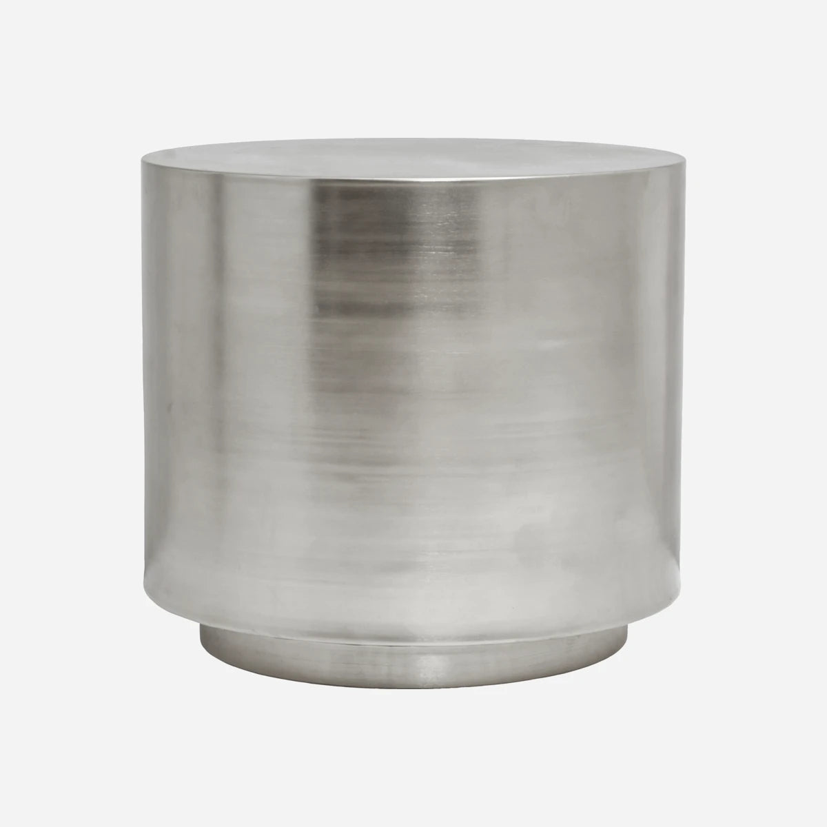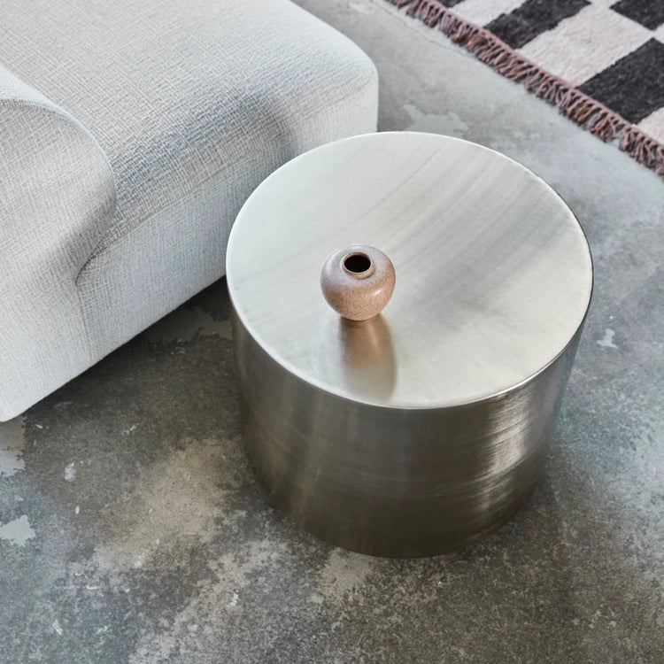 The HDStep side table is crafted from iron with a brushed silver finish. Its cylindrical design adds a sculptural, modern touch to any living space.
