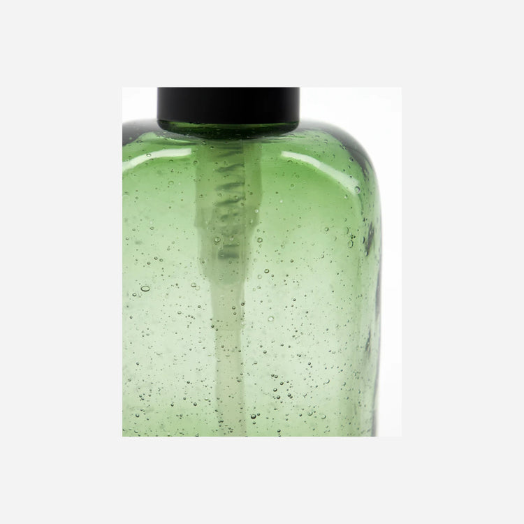The HDWah soap dispenser is made of deep green glass with subtle air bubbles and comes with a matt black pump. The minimalist design combines durability with a refined look.