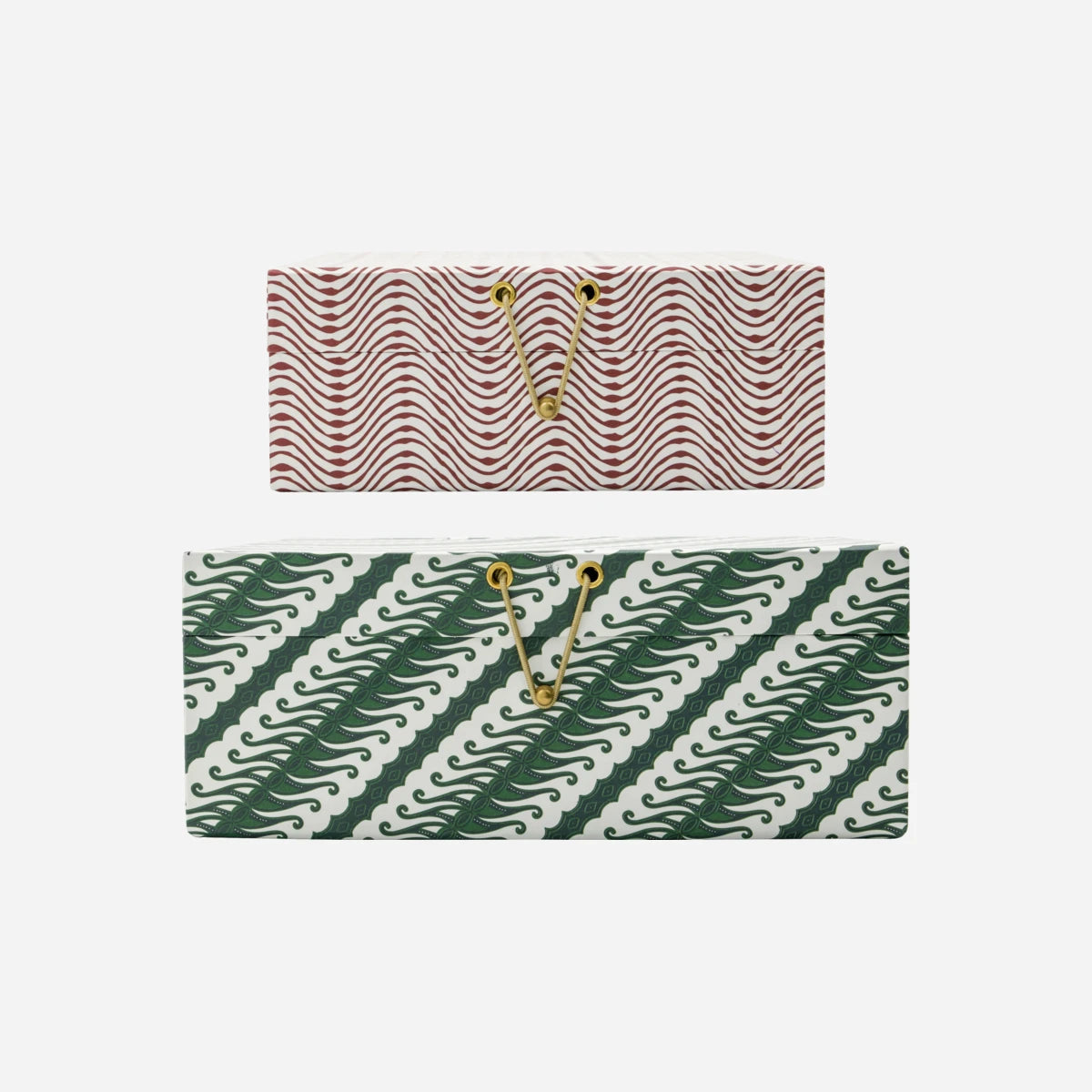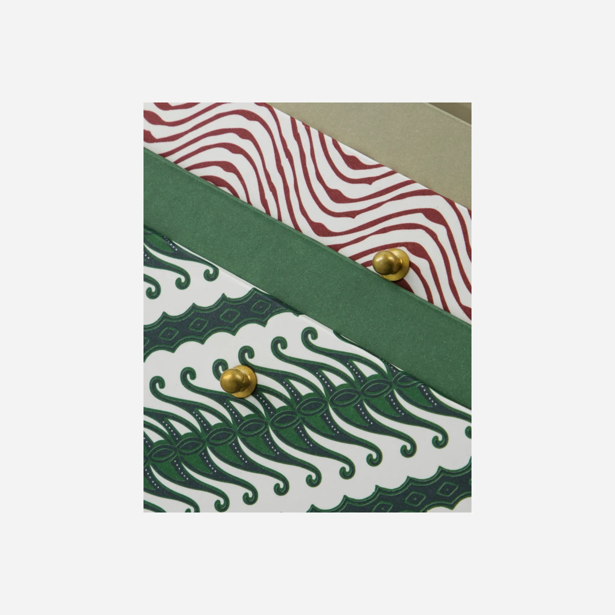 Add a touch of style and practicality to your home office with this set of decorative storage boxes. Featuring two unique designs in vibrant red and green, these cardboard boxes offer both visual appeal and functionality. They come in two different sizes, providing a versatile solution for organising your workspace. Each box is designed with a secure closure system comprising a golden button and a black elastic band, ensuring your items are kept safe while adding an elegant touch. The interior boasts a solid colour, contrasting beautifully with the patterned exterior, making these boxes a chic addition to any room.