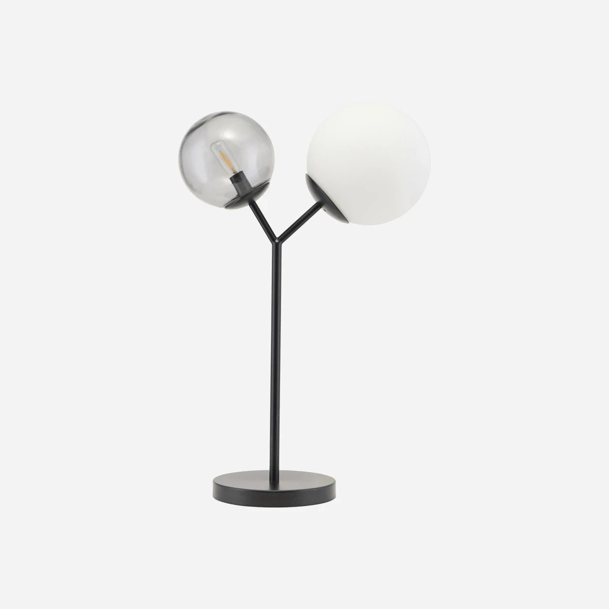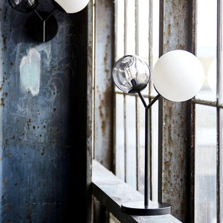 Twice from House Doctor is a beautiful and decorative table lamp that will look good in any home. It is designed with two handmade glass globes that make the lamp a focus piece. One is in a smoky, transparent colour while the other one is in white. Combined with the black iron lamp base, the lamp gets a raw and sculptural appeal that makes it decorative in any room. Place it on your dresser, a small side table in your living room or in the bedroom. Use this lamp as a cosy light source and decorative display. This product is handmade which means that variation in colour, size and shape may appear.