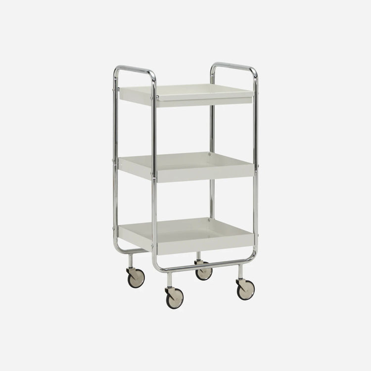 The HDRoll trolley features a chrome frame and off-white tray shelves. Its multi-level design offers versatile storage, making it perfect as a drinks trolley, kitchen shelf, or office organiser.
