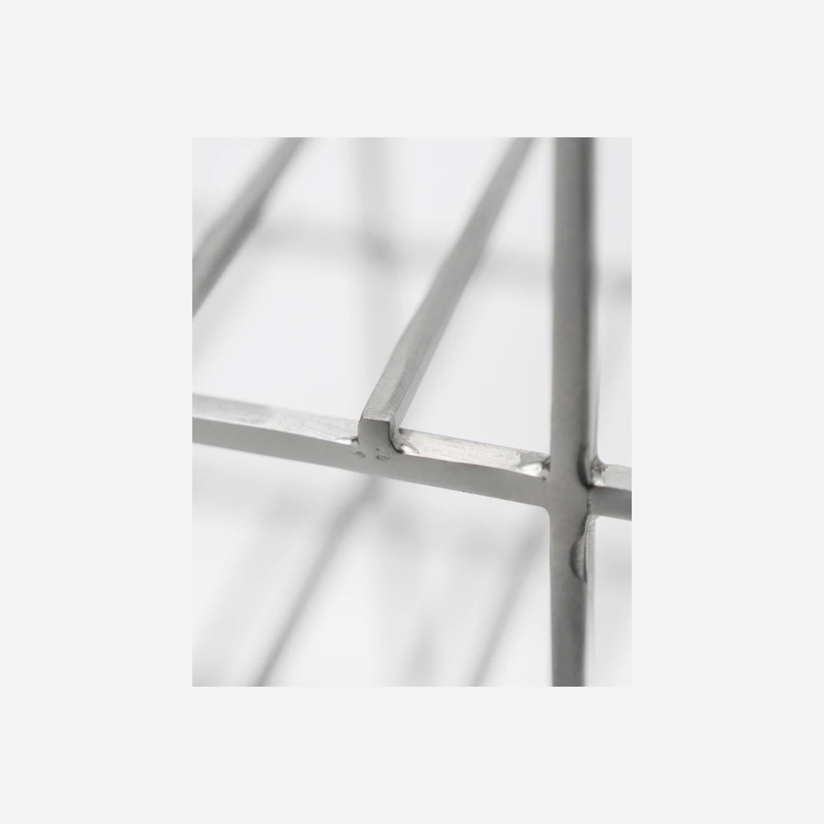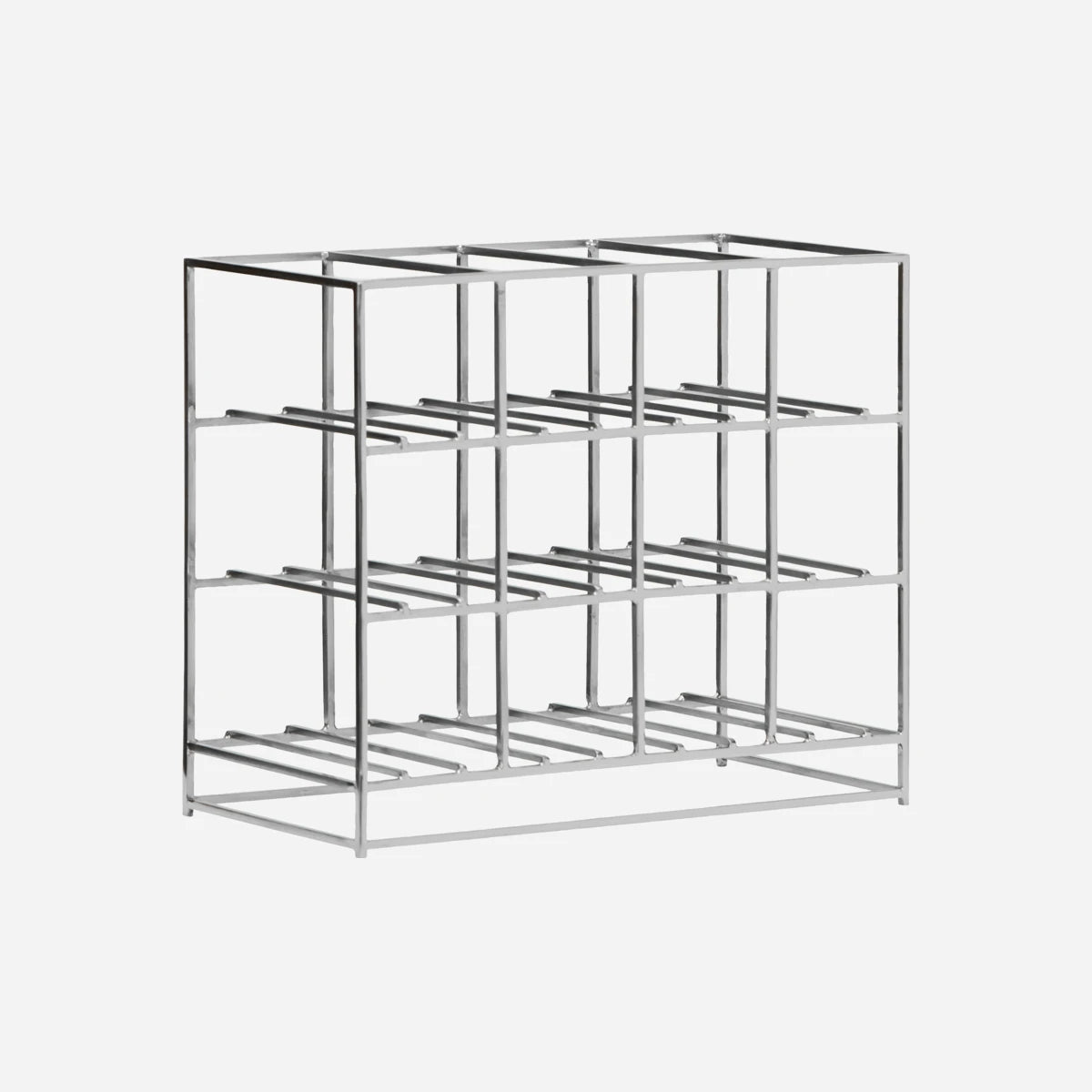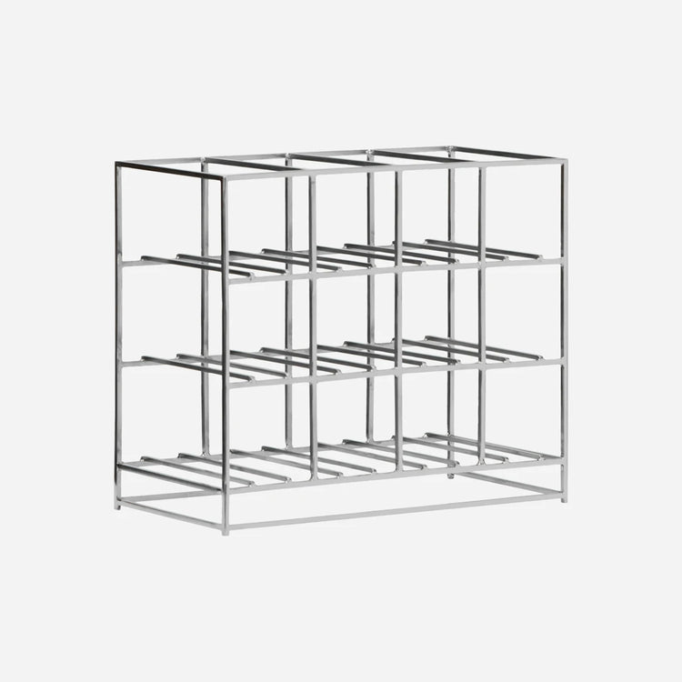 Made of iron with a brushed silver finish, the HD12 wine rack features a clean, geometric frame. It provides practical and elegant storage for wine.