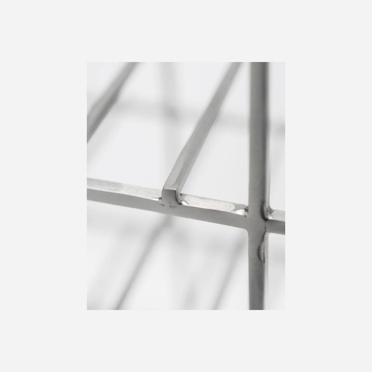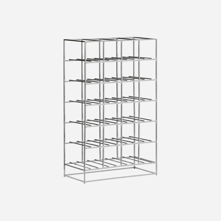The HD24 wine rack is crafted from durable iron with a sleek silver finish. Its open design offers a clear view of stored items while creating a light and airy feel. Perfect for displaying or organising wine bottles.